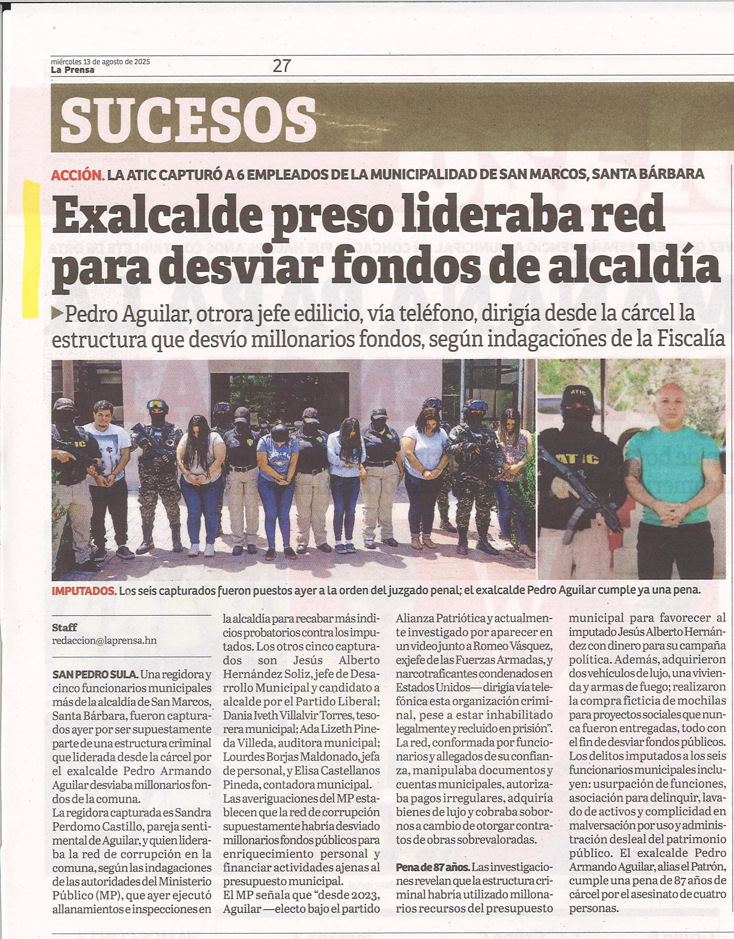 NacionalesPolicía Exalcalde preso lideraba red para desviar fondos de alcaldía Alejandra Irias Diario: La Prensa Fecha: 13 Agosto 2025 Página: 27