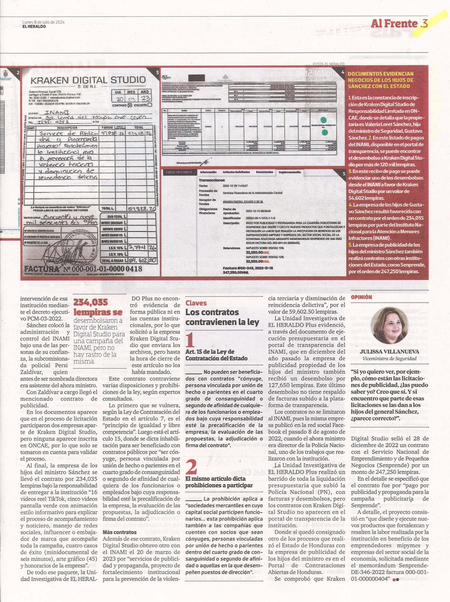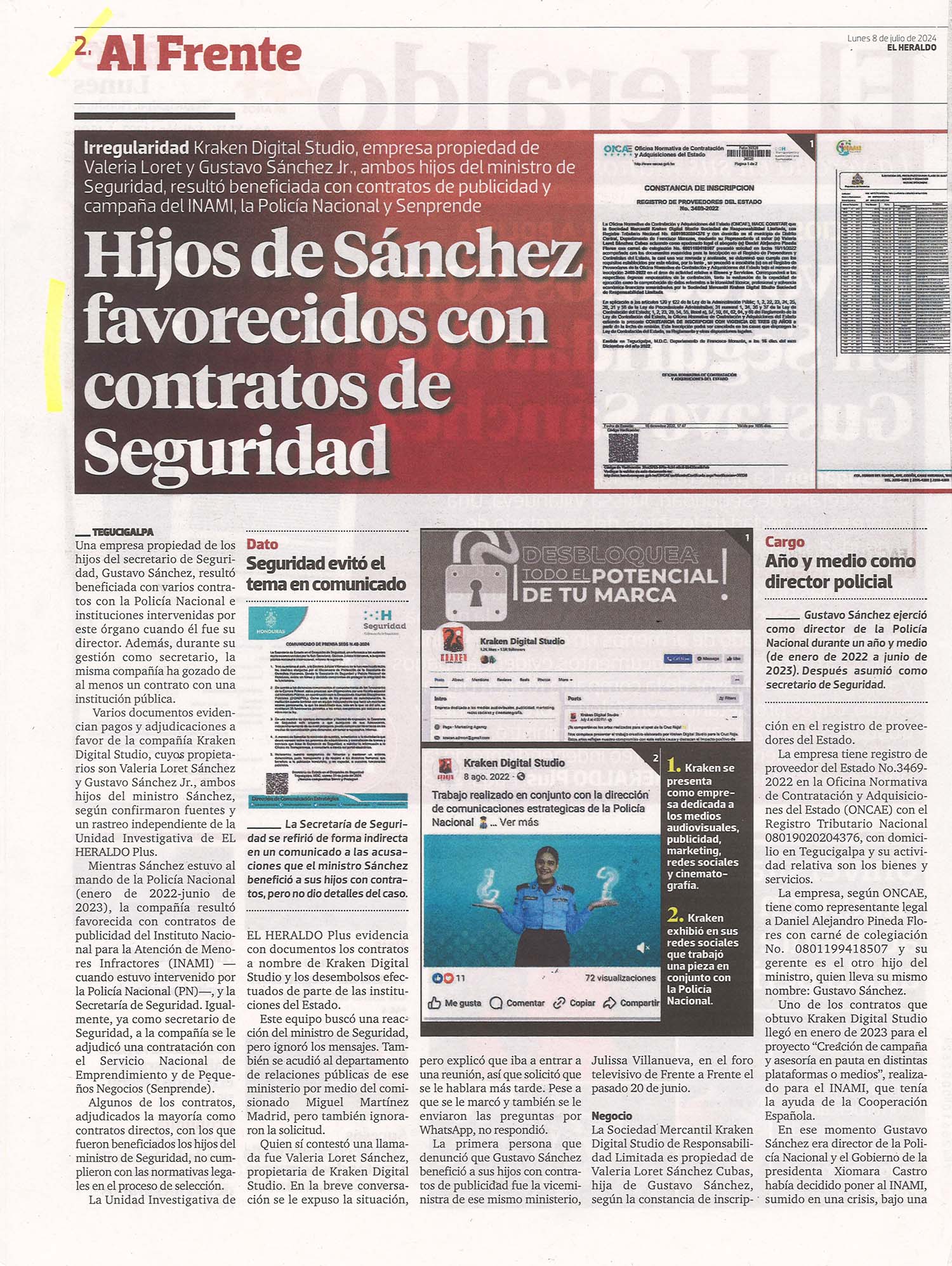 Nacionales Hijos de Sánchez favorecidos con contratos de seguridad Odeth Aguilera Diario: El Heraldo Fecha: 8 julio 2024 Páginas: 2 y 3