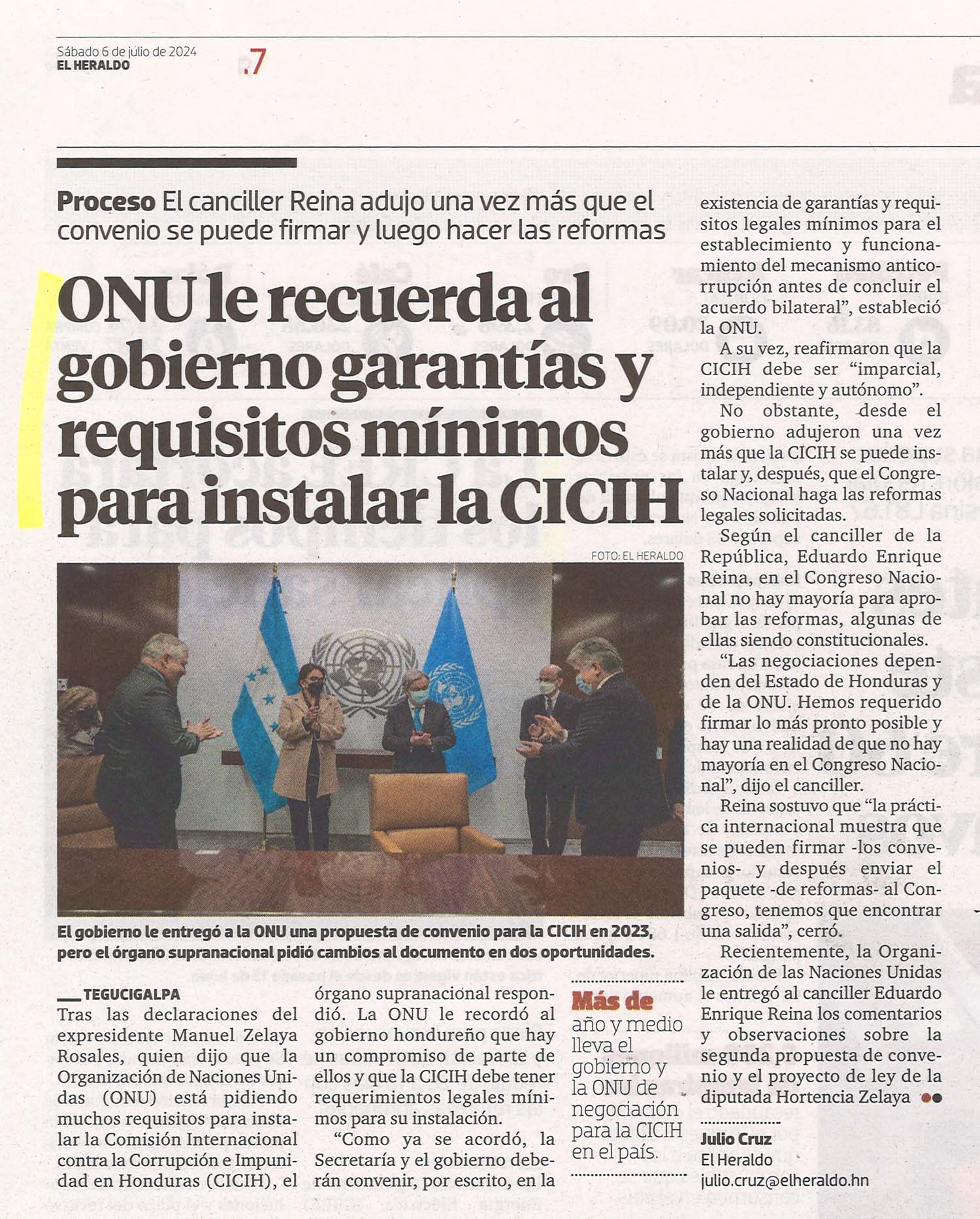 Nacionales ONU le recuerda al gobierno garantías y requisitos mínimos para instalar la CICIH Odeth Aguilera Diario: El Heraldo Fecha: 6 julio 2024 Página: 7