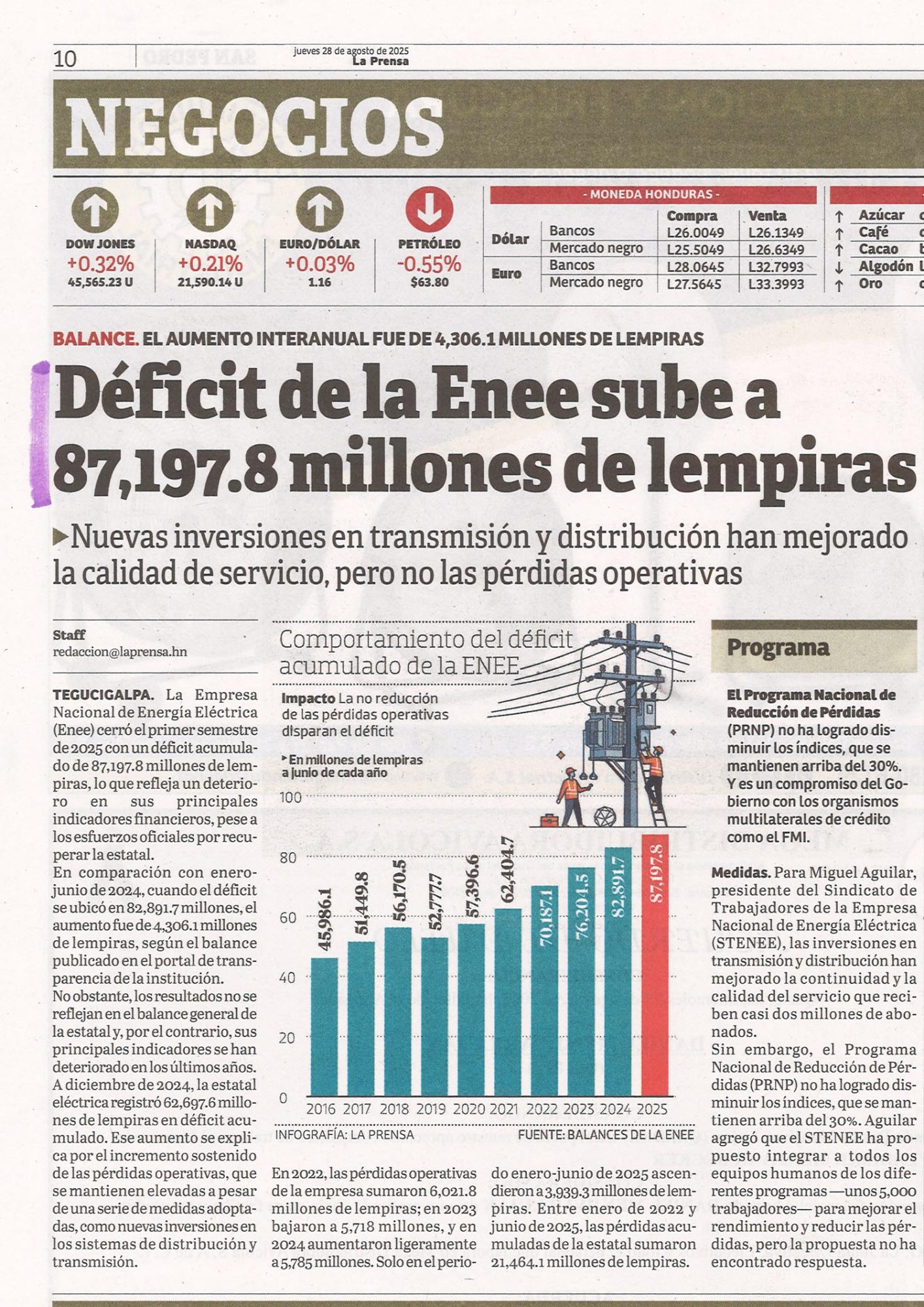 ENEENacionales Déficit de la Enee sube a 87,197.8 millones de lempiras Alejandra Irias Diario: La Prensa Fecha: 28 Agosto 2025 Página: 10