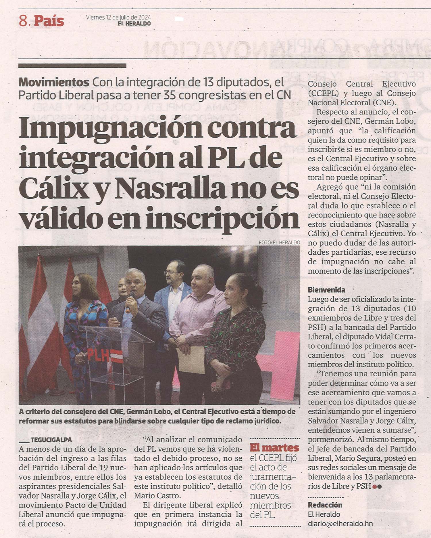 Nacionales Impugnación contra integración al PL de Cálix y Nasralla no es válido en inscripción Odeth Aguilera Diario: El Heraldo Fecha: 12 julio 2024 Página: 8