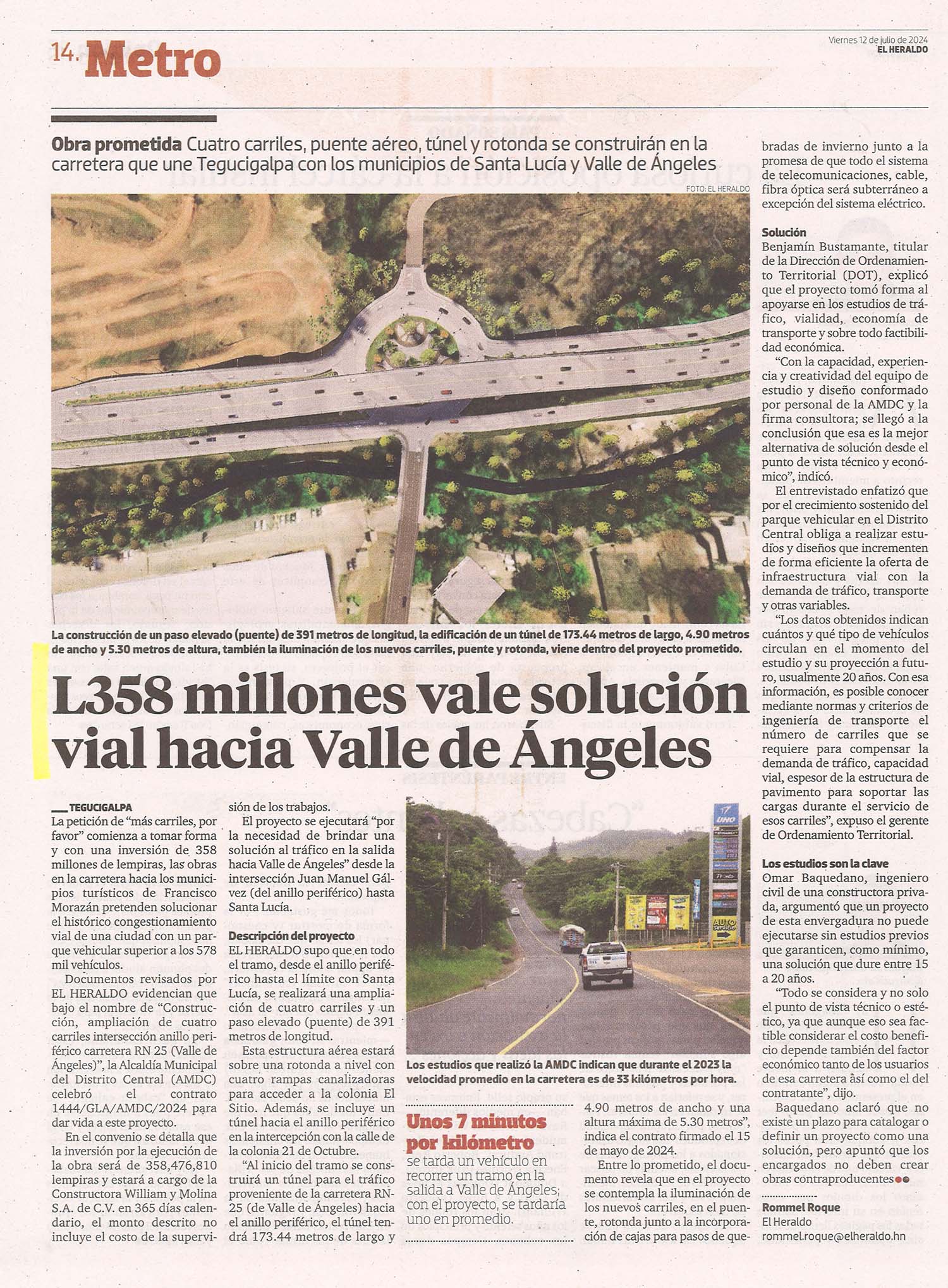 MunicipalidadesNacionales L358 millones vale solución vial hacia Valle de Ángeles Odeth Aguilera Diario: El Heraldo Fecha: 12 julio 2024 Página: 14
