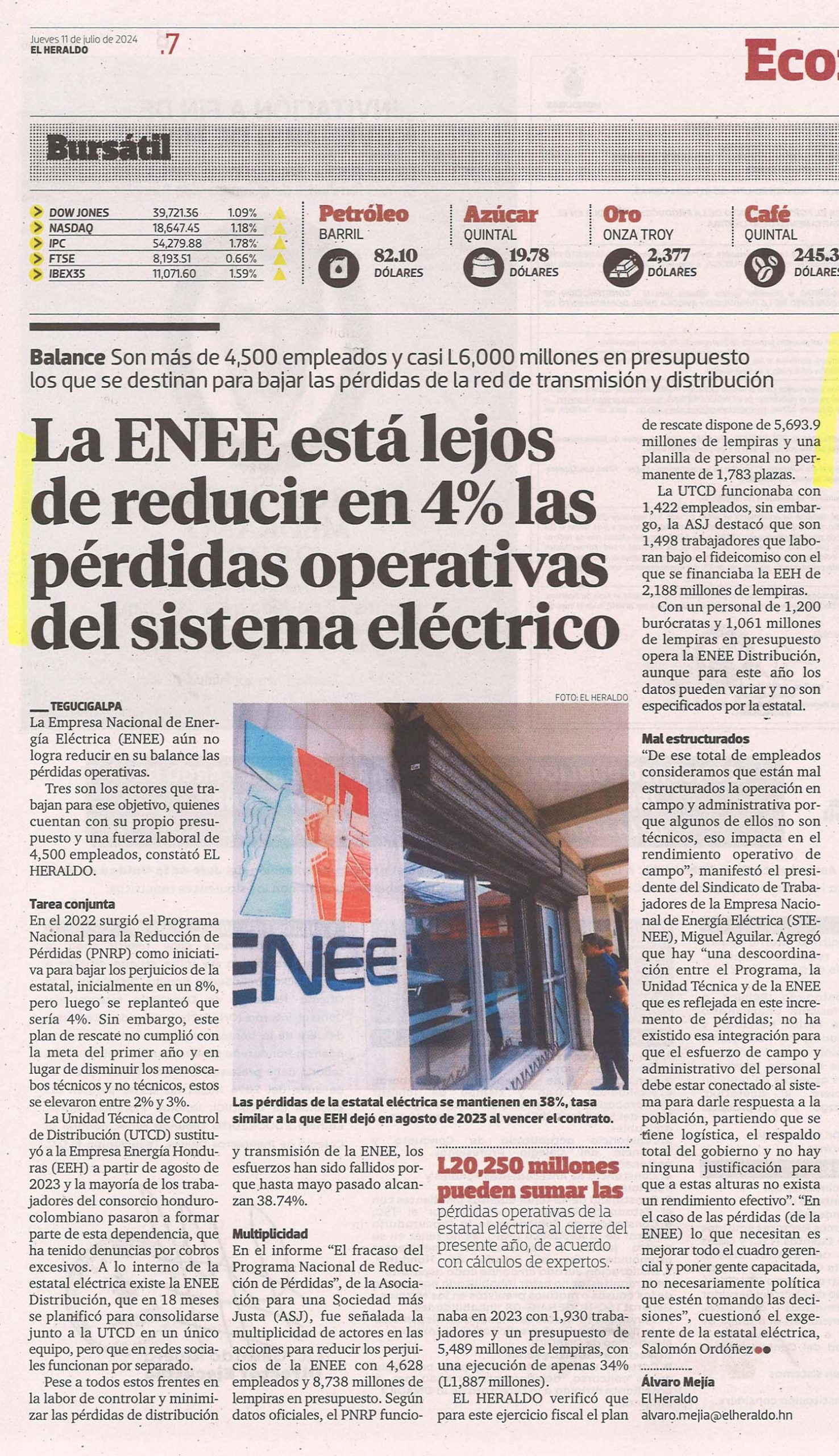 EconómicoENEENacionales La ENEE está lejos de reducir en 4% las pérdidas operativas del sistema eléctrico Odeth Aguilera Diario: El Heraldo Fecha: 11 julio 2024 Página: 7