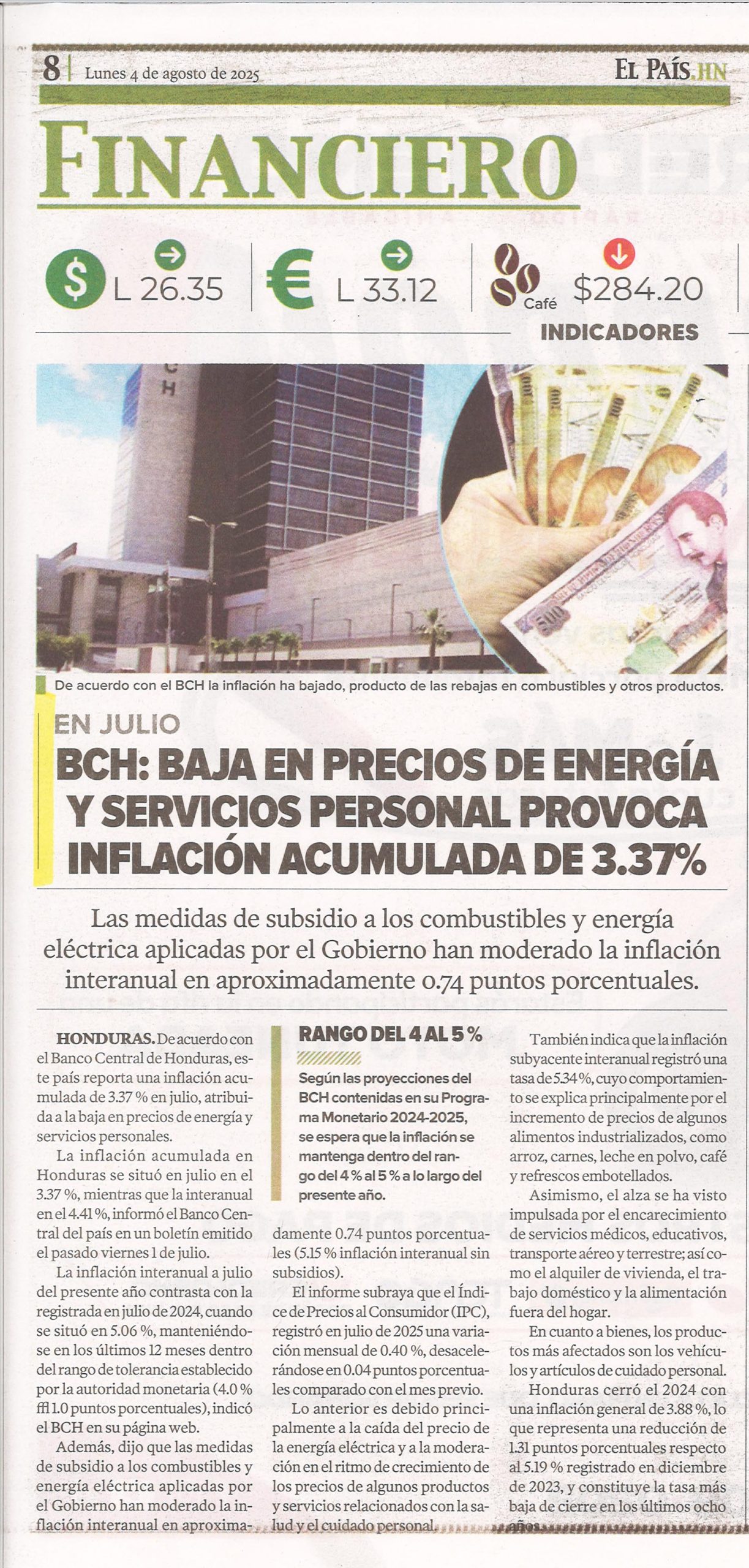 EconómicoNacionales BCH: Baja en precios de energía y servicios personal provoca inflación acumulada de 3.37% Alejandra Irias Diario: El País Página: 8 Fecha: 4 Agosto 2025