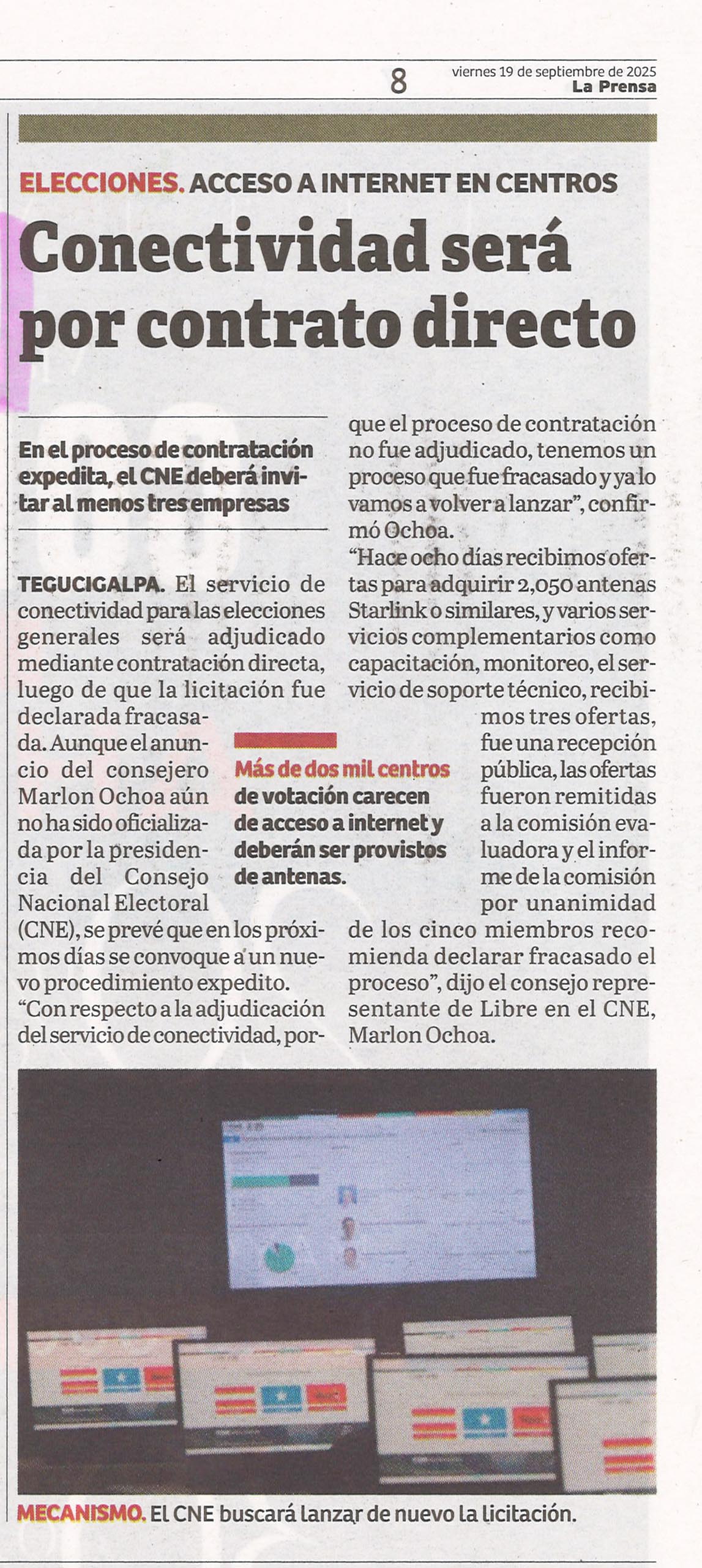 Casos EmblemáticosNacionales Conectividad será por contrato directo Alejandra Irias Diario: La Prensa Fecha: 19 Septiembre 2025 Página: 8
