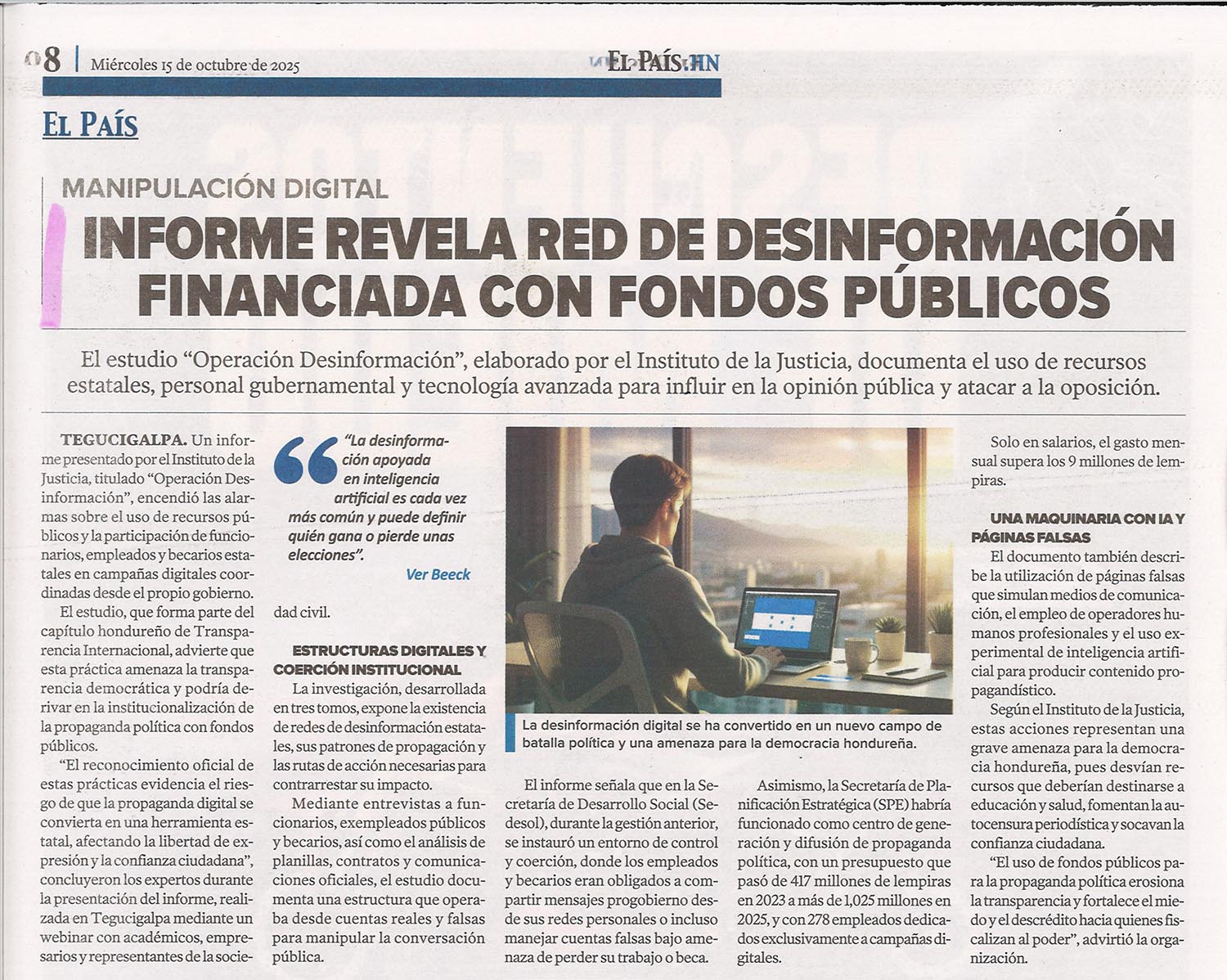 Nacionales INFORME REVELA RED DE DESINFORMACIÓN FINANCIADA CON FONDOS PÚBLICOS. Meredith Andino Diario: El País Fecha: 15 de octubre de 2025 Página: 8