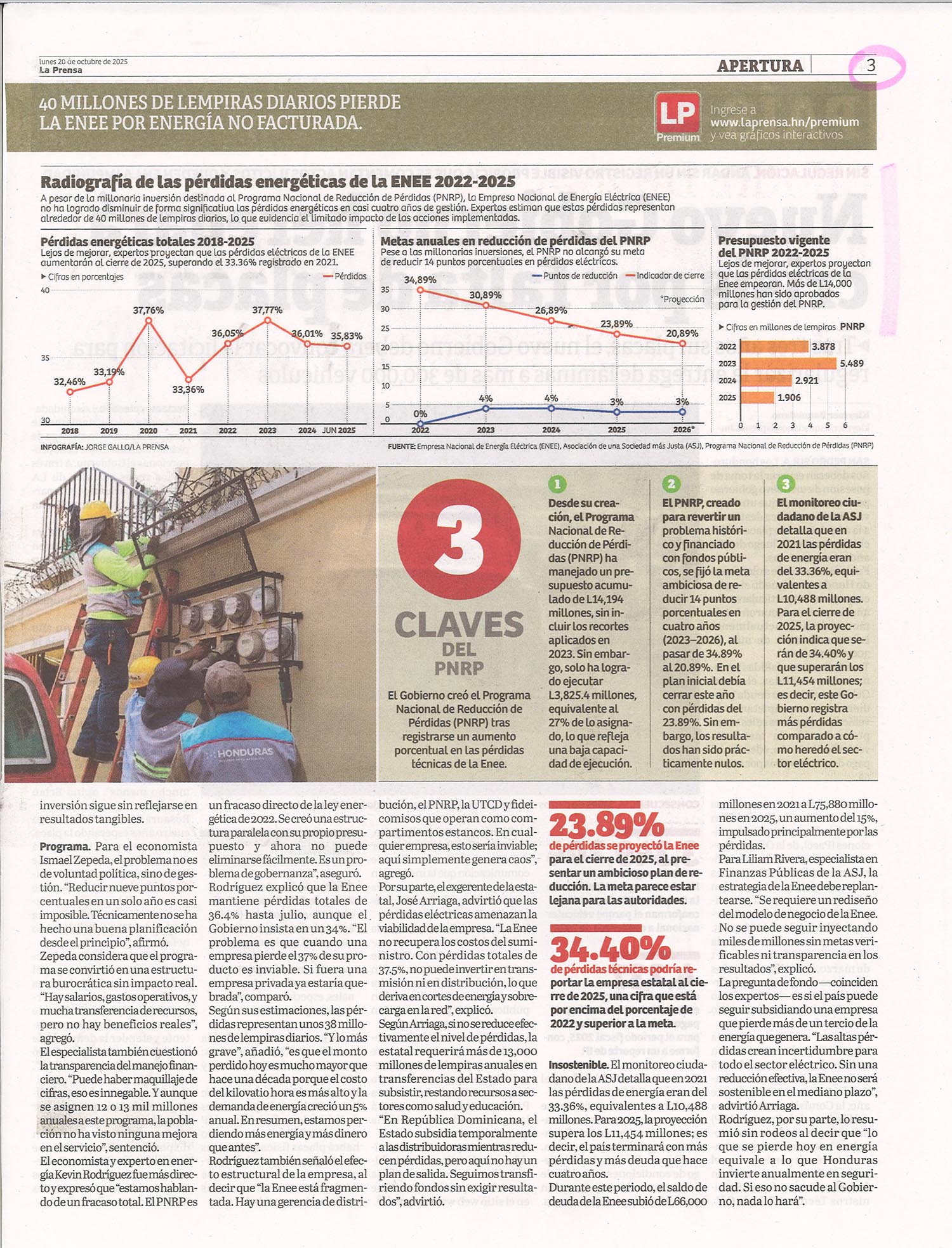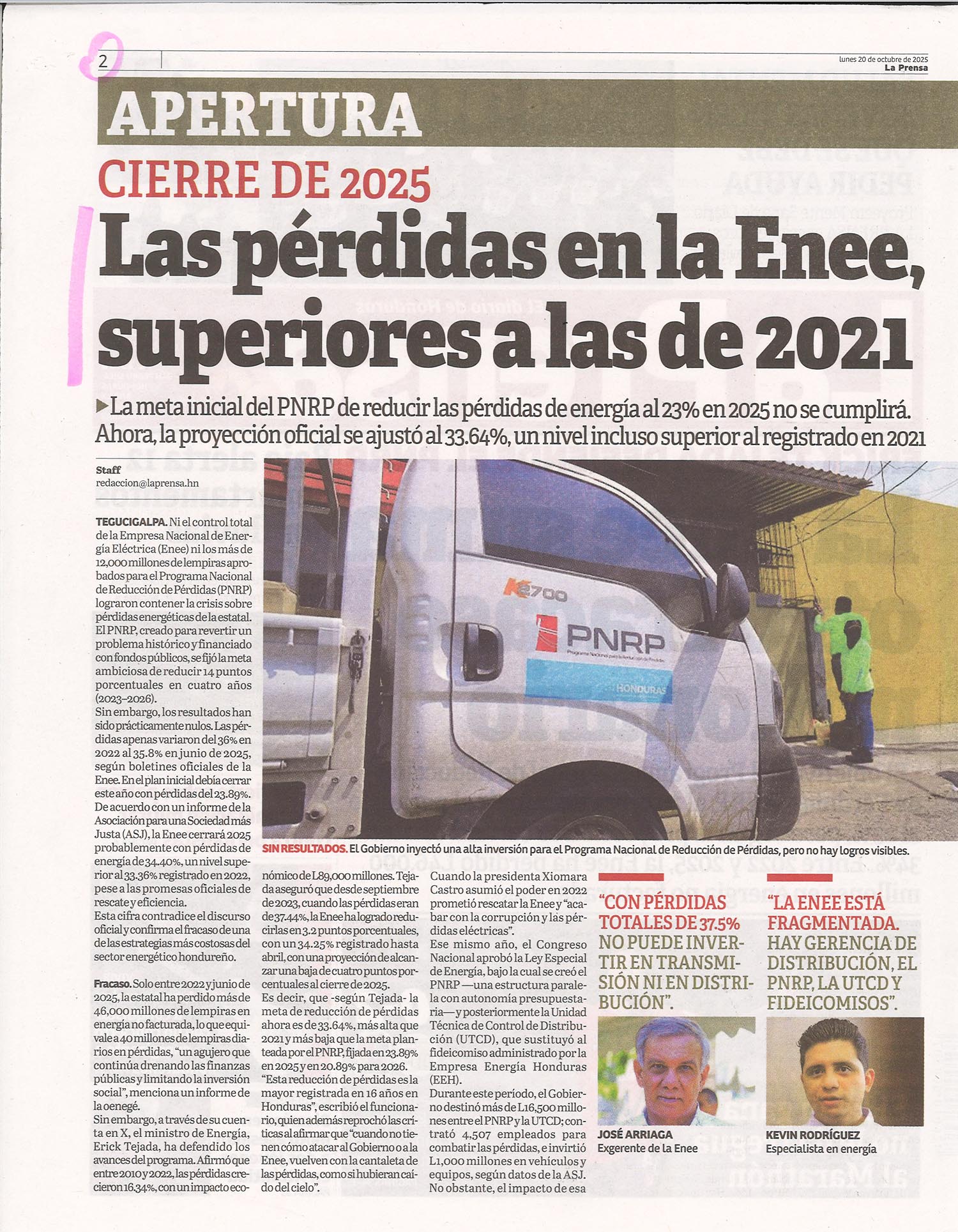 ENEENacionales Las pérdidas en la Enee, superiores a las de 2021 Meredith Andino Diario: La Prensa Fecha: 20 de octubre de 2025 Páginas: 2-3