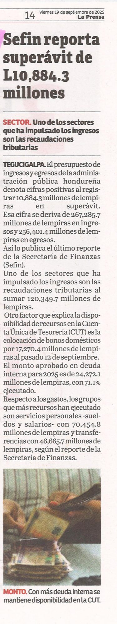 EconómicoNacionales Sefin reporta superávit de L10,884.3 millones Alejandra Irias Diario: La Prensa Fecha: 19 Septiembre 2025 Página: 14