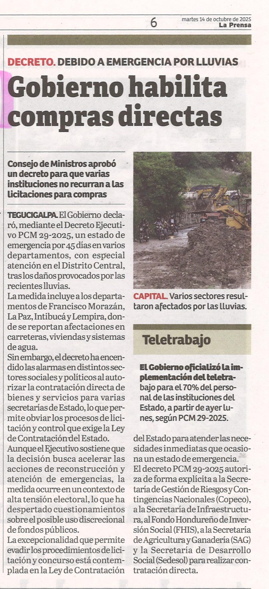 Nacionales Gobierno habilita compras directas. Meredith Andino Diario: La Prensa Fecha: 14 de octubre de 2025 Página: 6