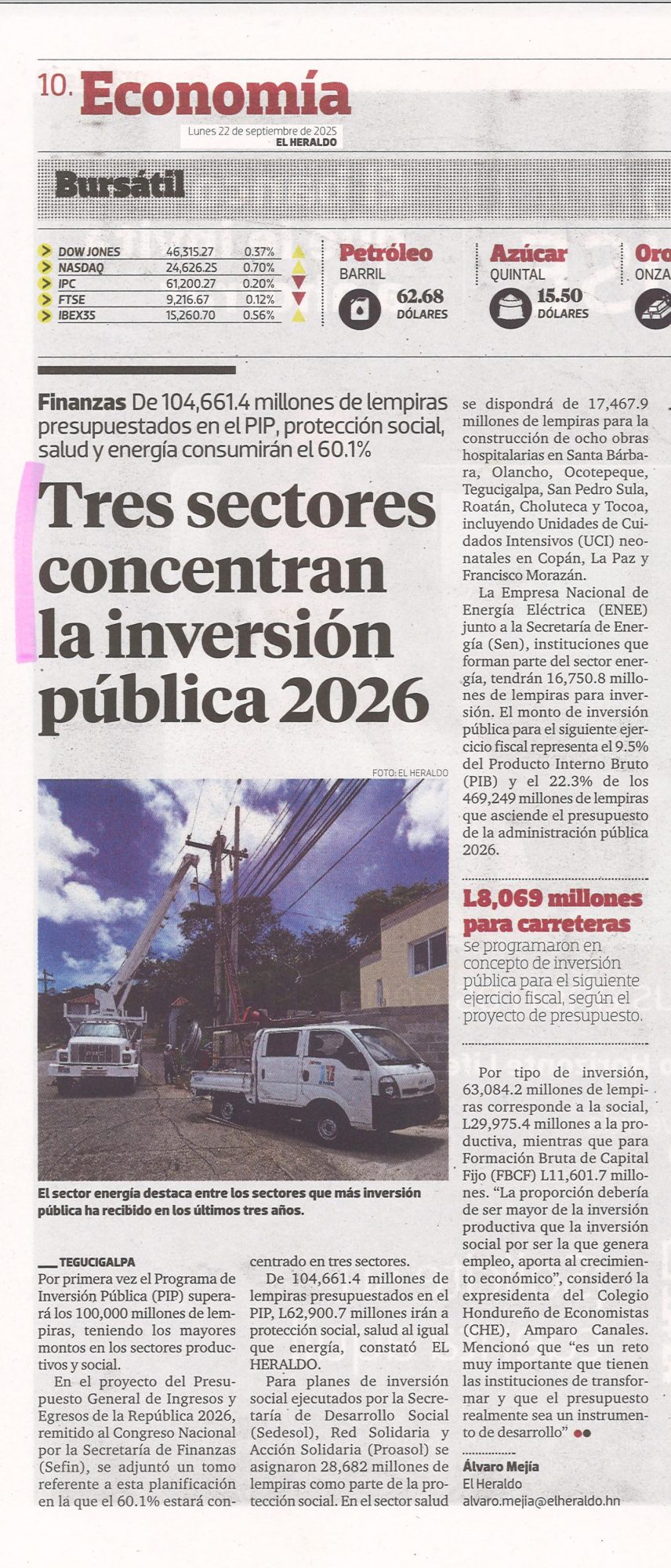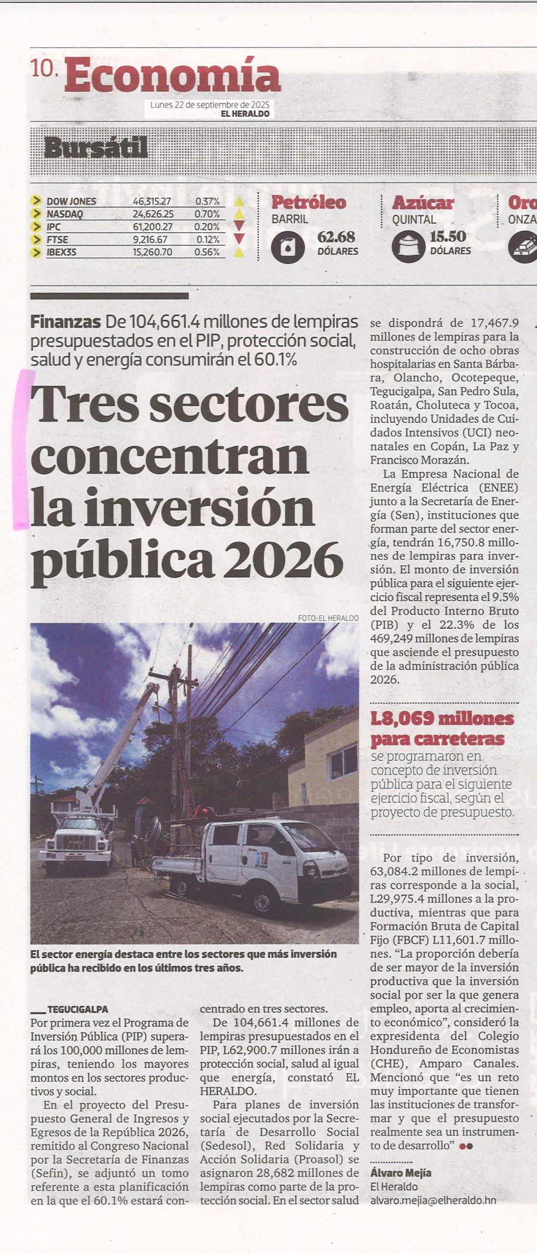 EconómicoNacionales Tres sectores concentran la inversión pública 2026 Alejandra Irias Diario: EL Heraldo Fecha: 22 Septiembre 2025 Página: 10