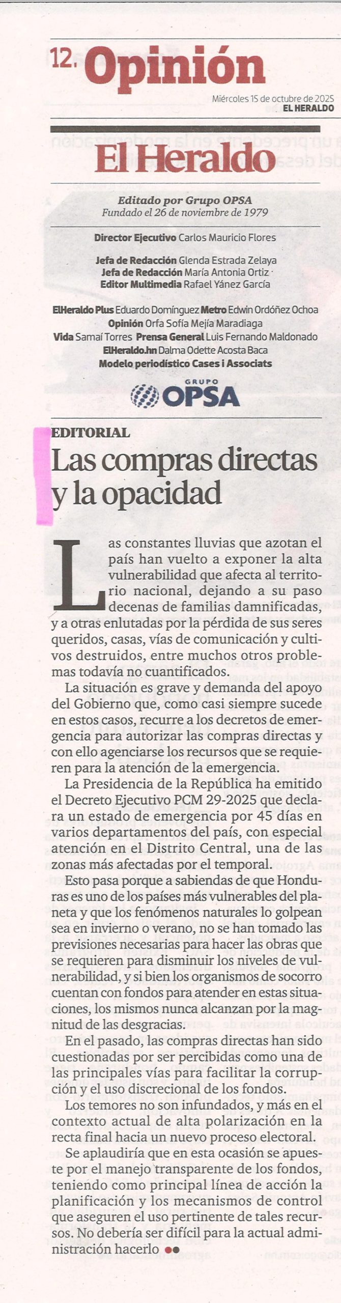 NacionalesOpiniónSin categoría Las compras directas y la opacidad. Meredith Andino Diario: El Heraldo Fecha: 15 de octubre de 2025 Página: 12