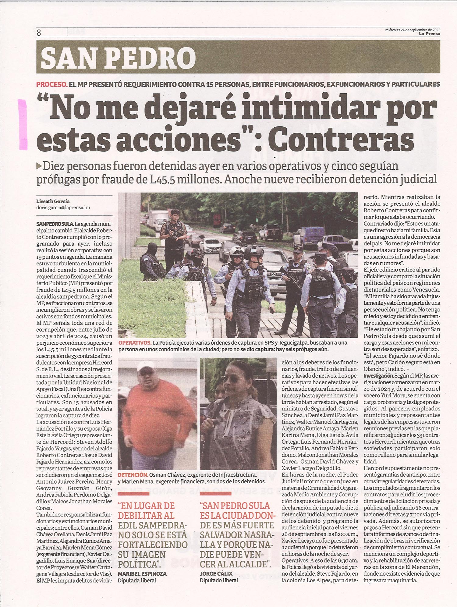 DenunciasNacionales «No me dejaré intimidar por estas acciones»: Contreras» Alejandra Irias Diario: La Prensa Fecha: 24 Septiembre 2025 Página: 8