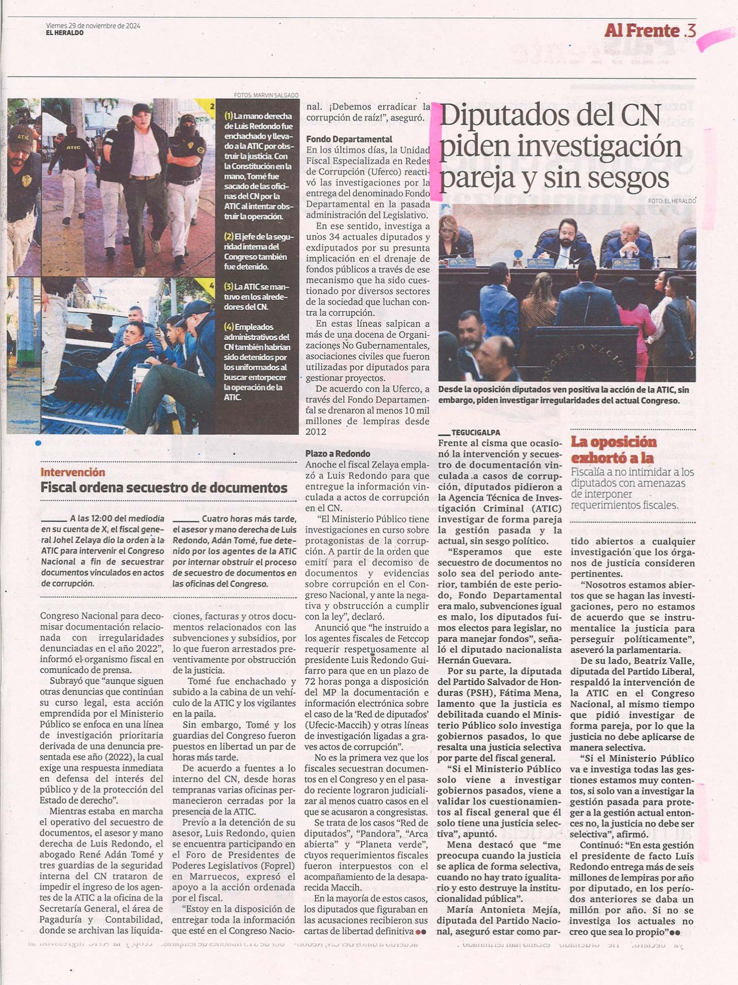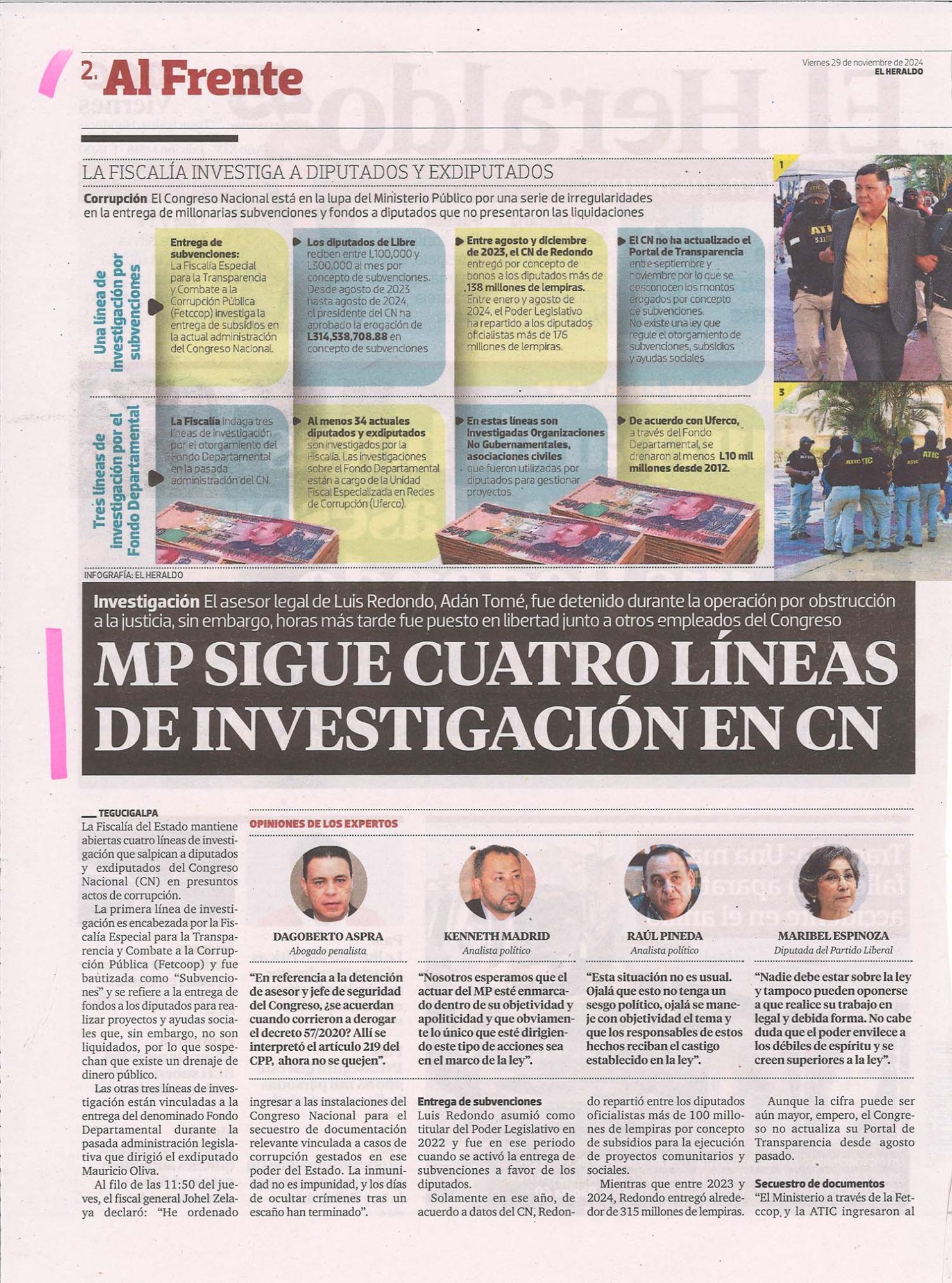 Nacionales MP sigue cuatro líneas de investigación en CN Odeth Aguilera Diario: El Heraldo Fecha: 29 noviembre 2024 Otros Titulares: Diputados del CN piden investigación pareja y sin sesgos Páginas: 2 y 3