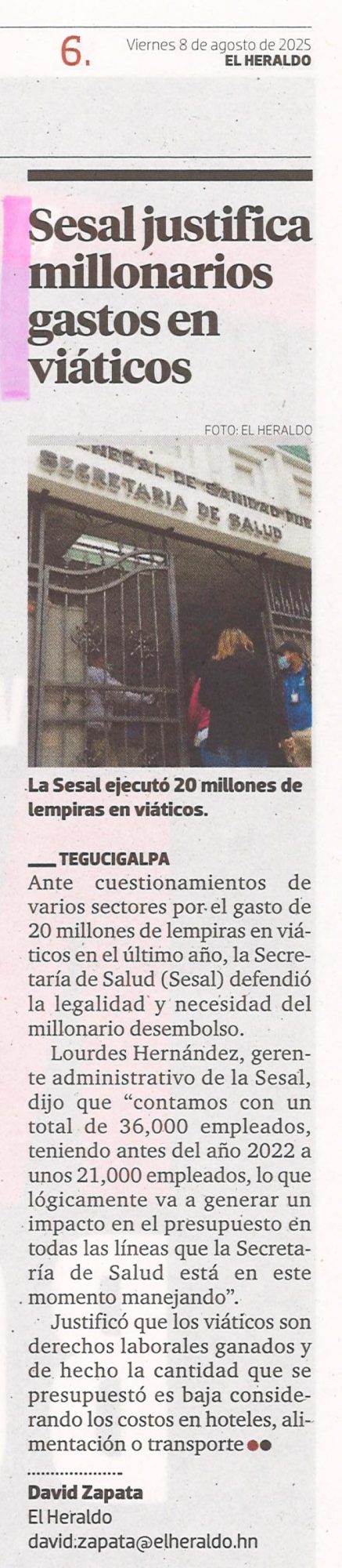 EconómicoSalud Sesal justifica millonarios gastos en viáticos Francis Lanza Diario: El Heraldo Fecha: 8 agosto 2025 Página: 6