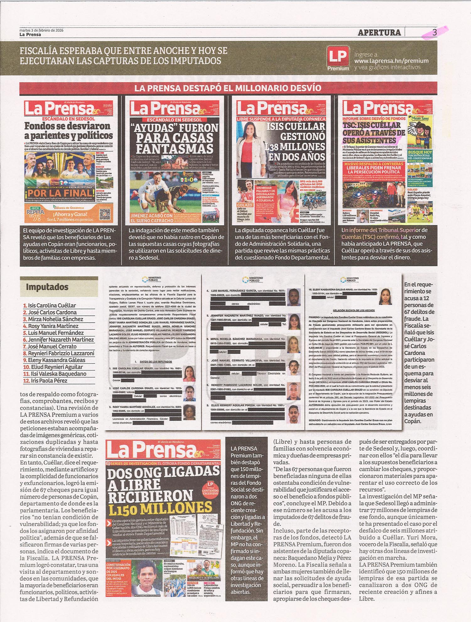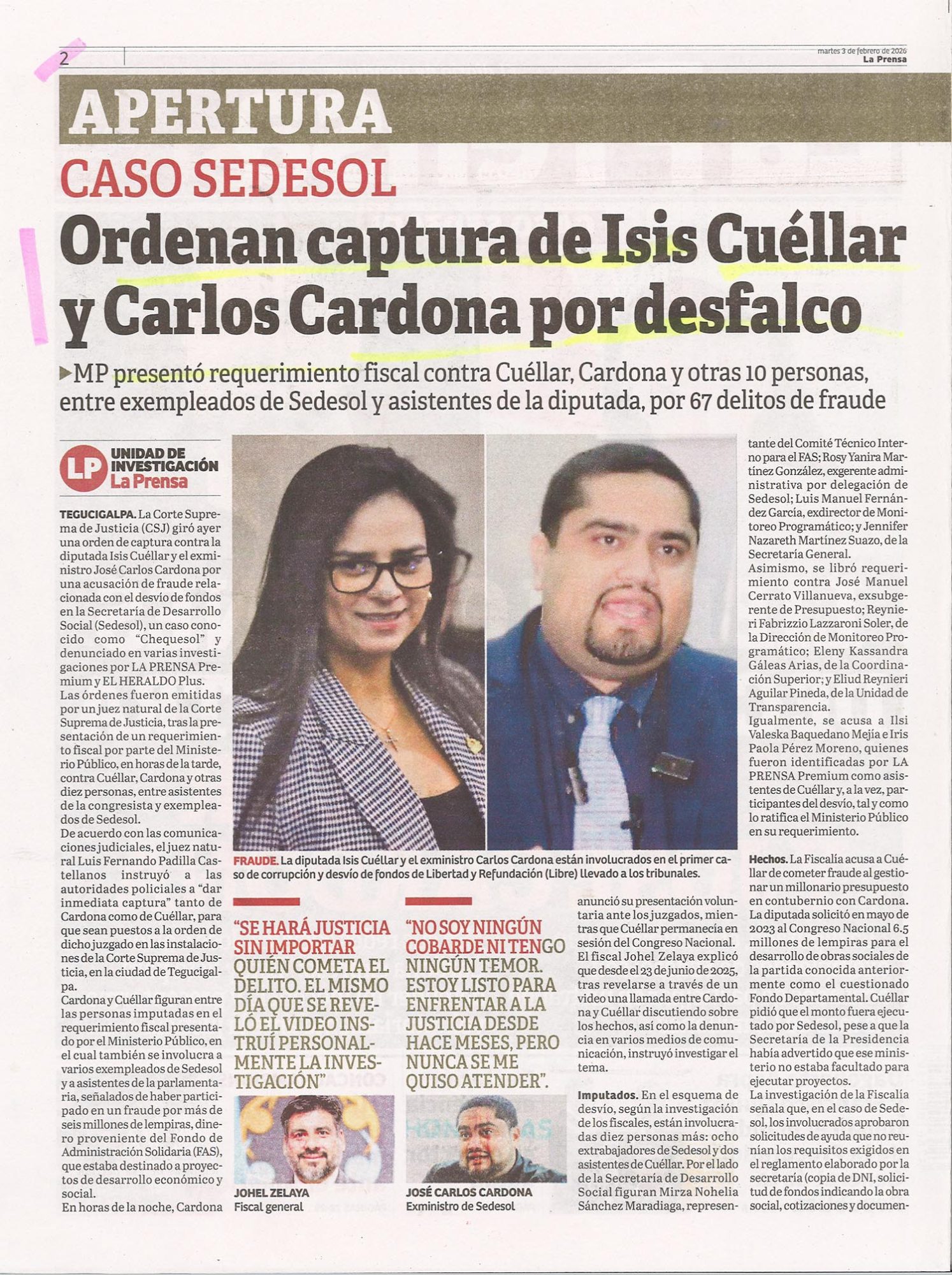 Casos EmblemáticosTSC Caso Sedesol: Ordenan captura de Isis Cuéllar y Carlos Cardona por desfalco ebueso Diario: La Prensa Fecha: 3 de febrero de 2026 Páginas: 2 y 3
