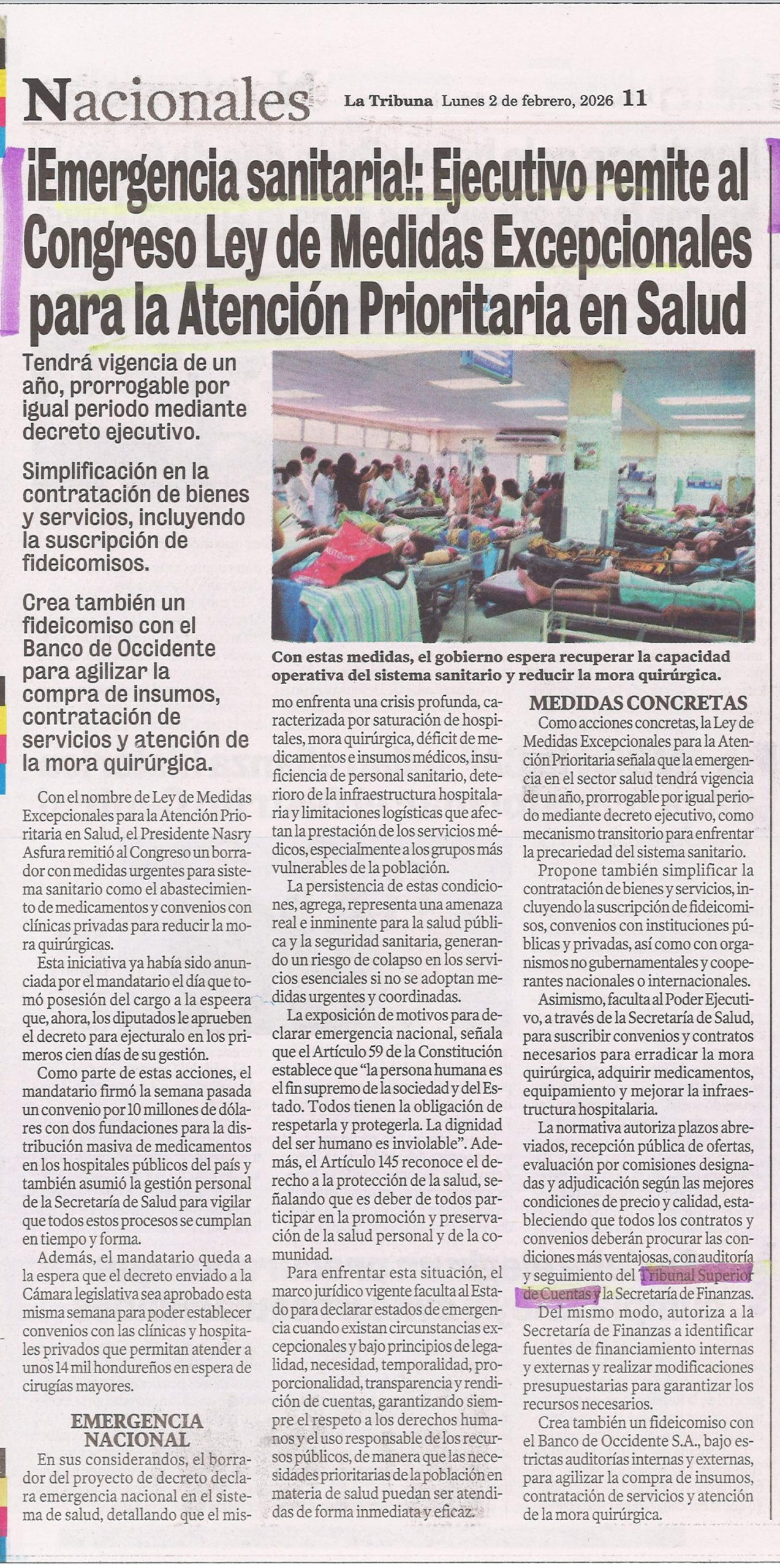 TSC ¡Emergencia sanitaria!: Ejecutivo remite al Congreso Ley de Medidas Excepcionales para la Atención Prioritaria en Salud ebueso Diario: La Tribuna Fecha: 2 de febrero de 2026 Página: 11