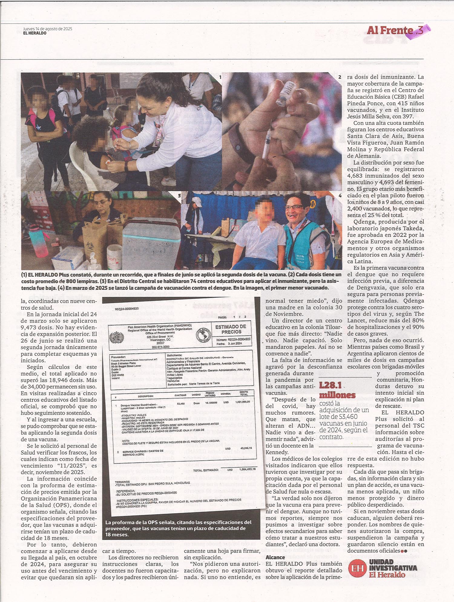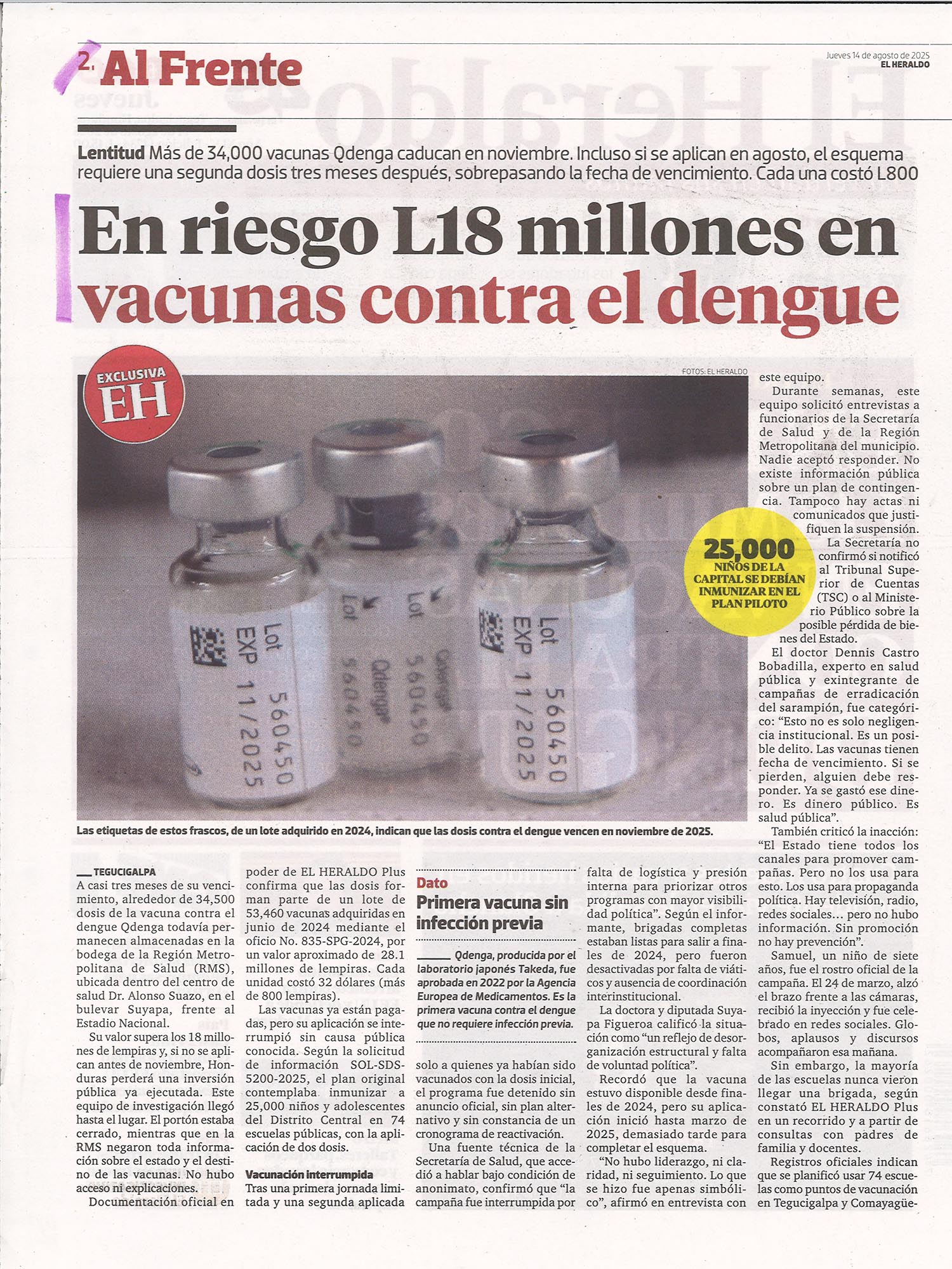 SaludTSC En riesgo L18 millones en vacunas contra el dengue Francis Lanza Diario: El Heraldo Fecha: 14 agosto 2025 Páginas: 2 y 3