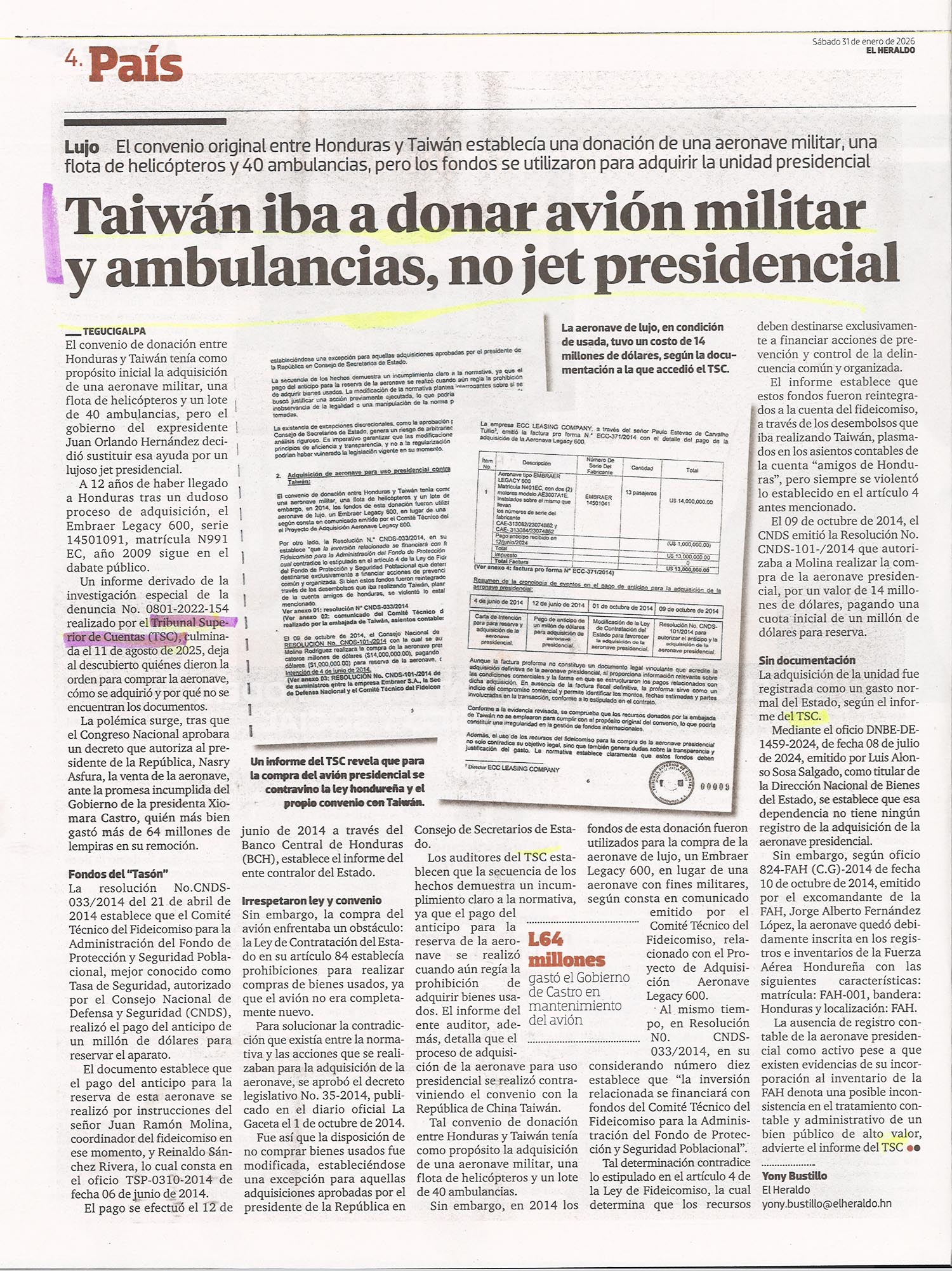 Casos EmblemáticosTSC Taiwán iba a donar avión militar y ambulancias, no jet presidencial ebueso Diario: El Heraldo Fecha: 31 de enero de 2026 Página: 4