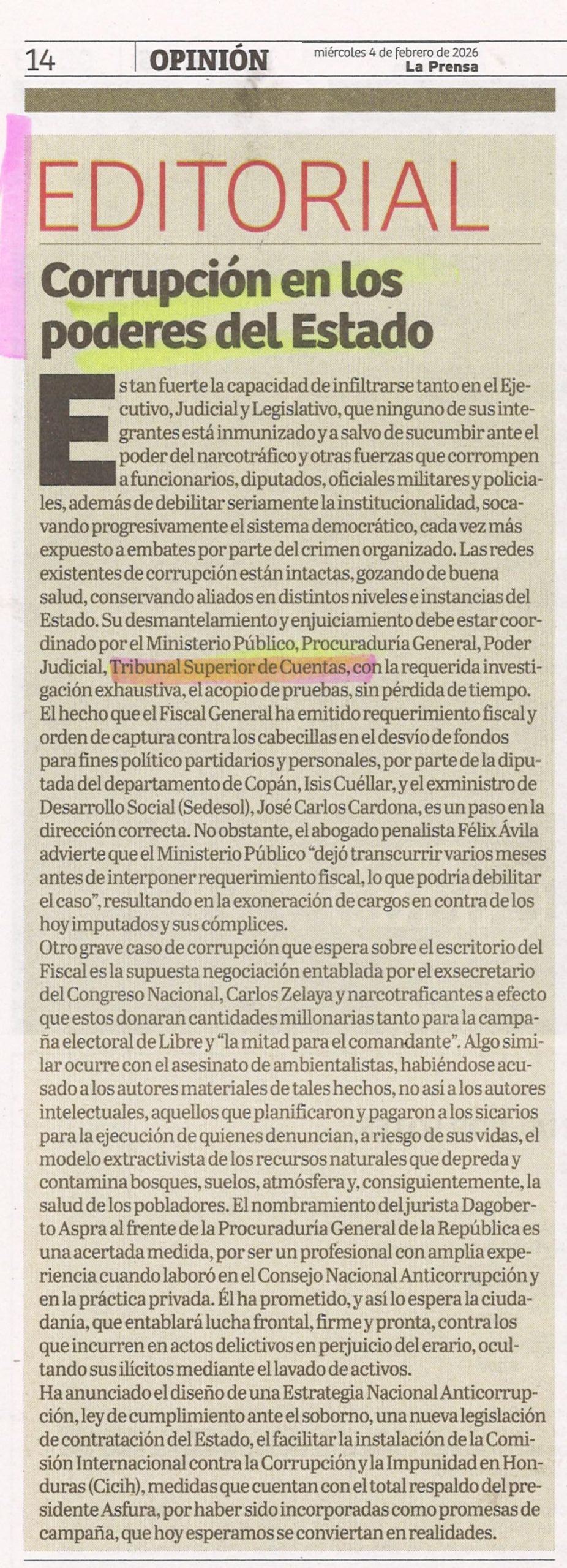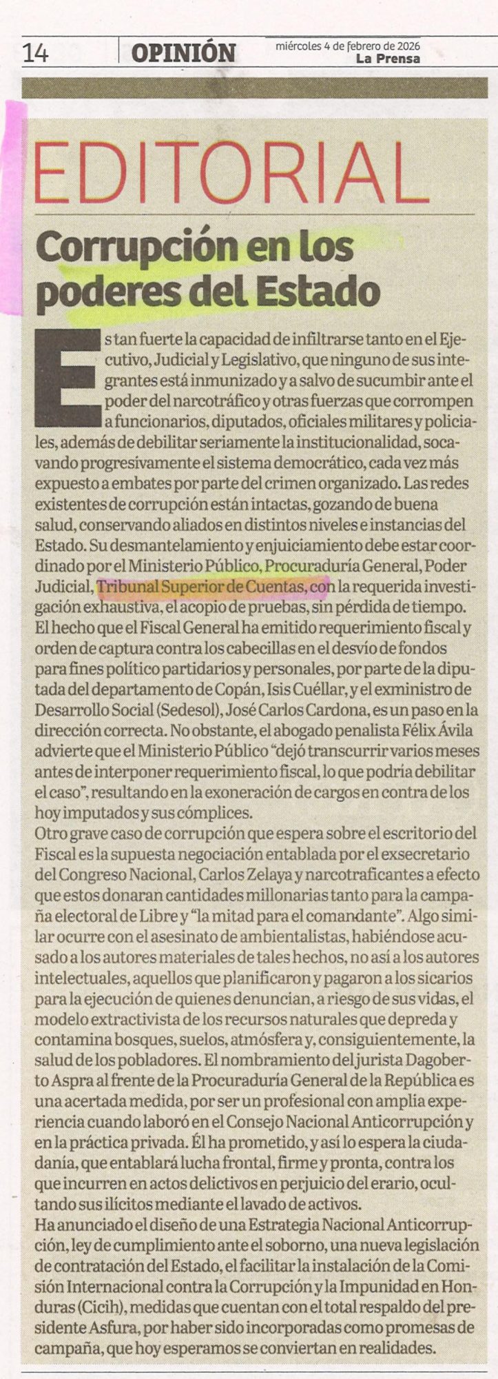 OpiniónTSC Editorial: Corrupción en los poderes del Estado ebueso Diario: La Prensa Fecha: 4 de febrero de 2026 Página: 14