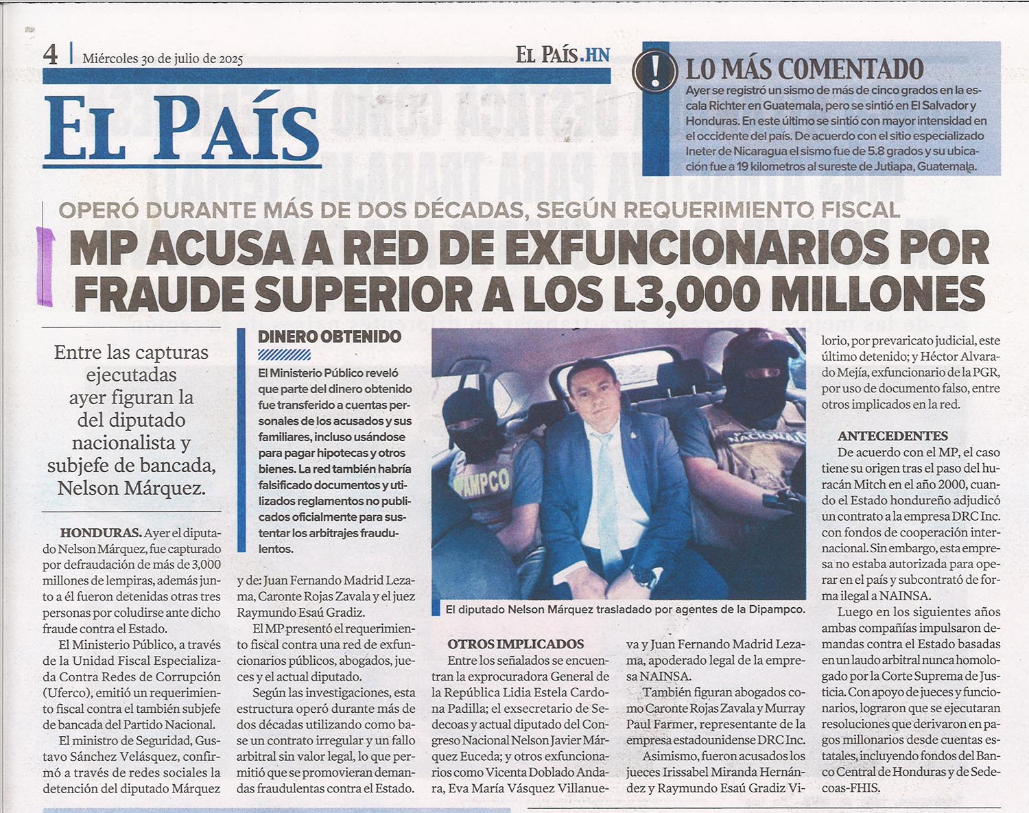 Nacionales MP acusa a red de exfuncionarios por fraude superior a los L3,000 millones Odeth Aguilera Diario: El País Fecha: 30 julio 2025 Página: 4