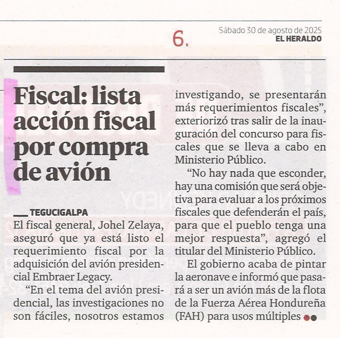 Nacionales Fiscal: lista acción fiscal por compra de avión Francis Lanza Diario: El Heraldo Fecha: 30 agosto 2025 Página: 6