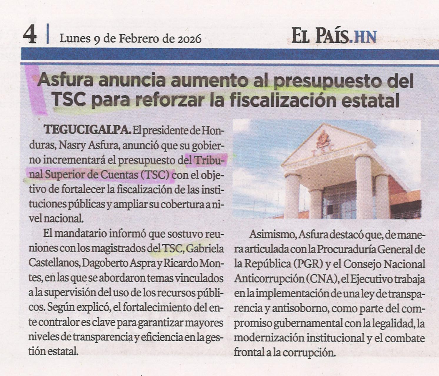 TSC Asfura anuncia aumento al presupuesto del TSC para reforzar la fiscalización estatal ebueso Diario: El País Fecha: 9 de febrero de 2026 Página: 4