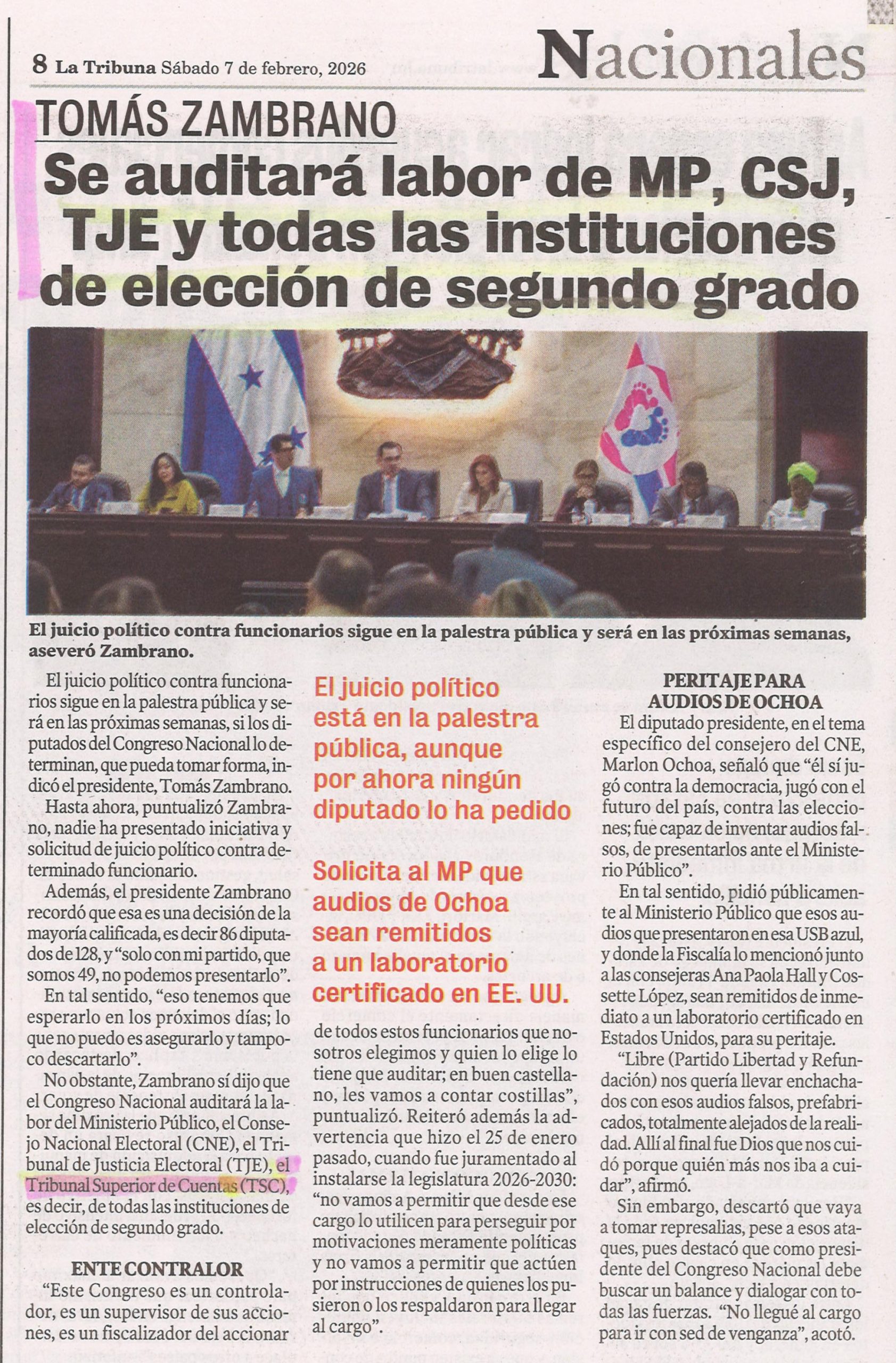 TSC Tomás Zambrano: Se auditará labor de MP, CSJ, TJE y todas las instituciones de elección de segundo grado ebueso Diario: La Tribuna Fecha: 7 de febrero de 2026 Página: 8