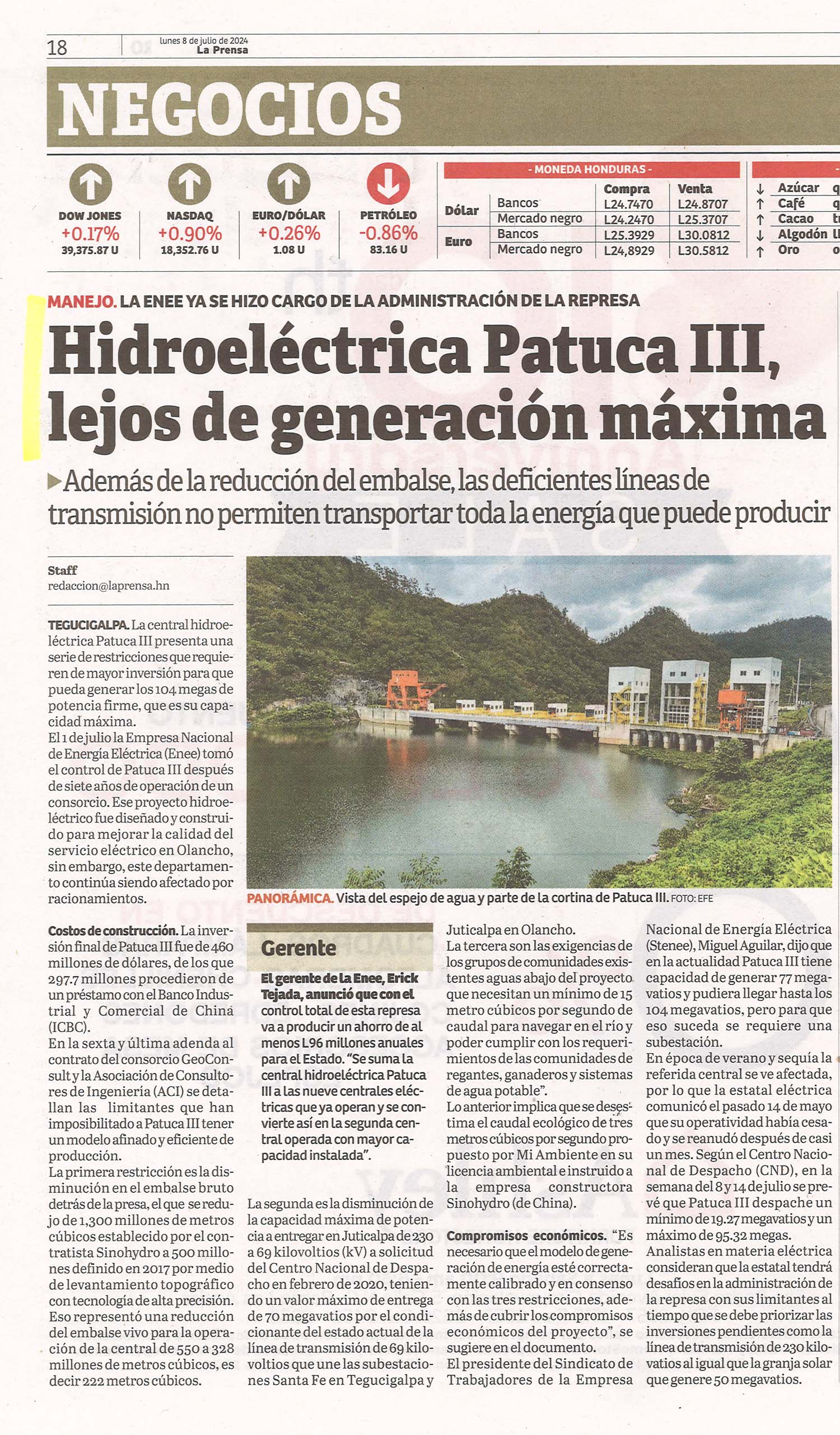 EconómicoENEENacionales Hidroeléctrica Patuca III, lejos de generación máxima Odeth Aguilera Diario: La Prensa Fecha: 8 julio 2024 Página: 18