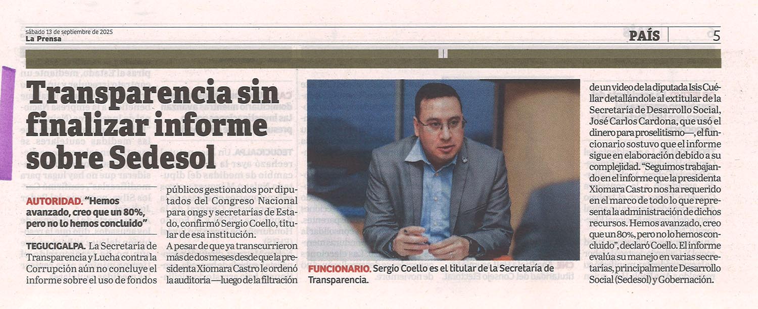 Nacionales Transparencia sin finalizar informe sobre Sedesol Odeth Aguilera Diario: La Prensa Fecha: 13 Septiembre 2025 Página: 5