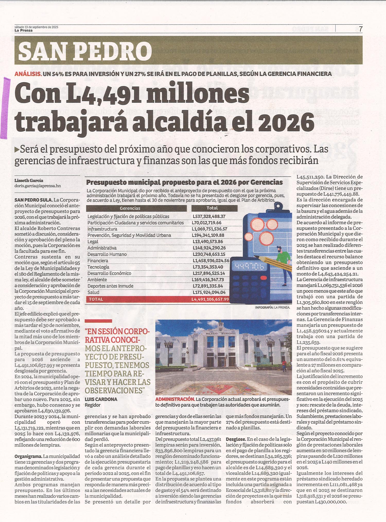 MunicipalidadesNacionales Con L4,491 millones trabajará alcaldía el 2026 Odeth Aguilera Diario: La Prensa Fecha: 13 septiembre 2025 Página: 7