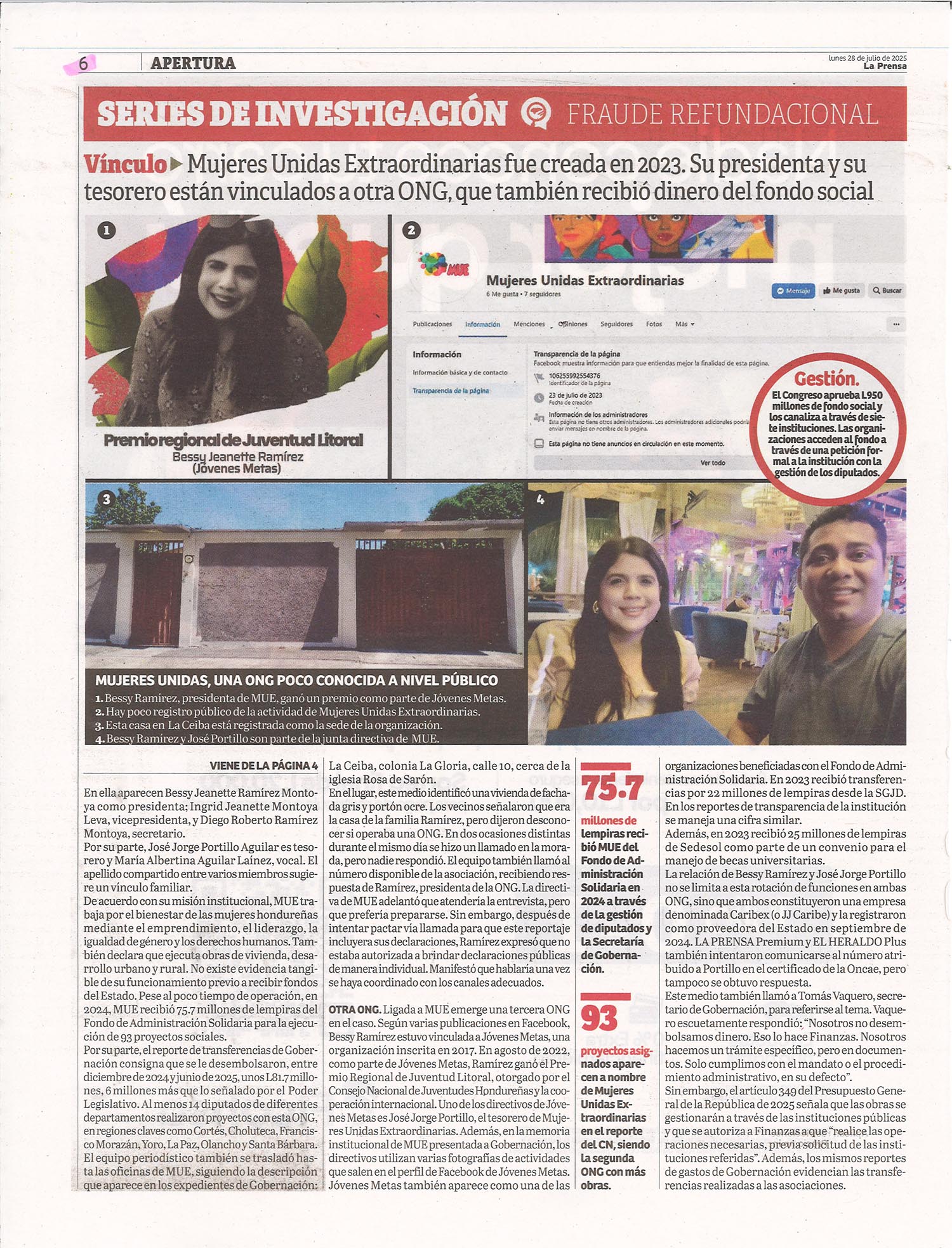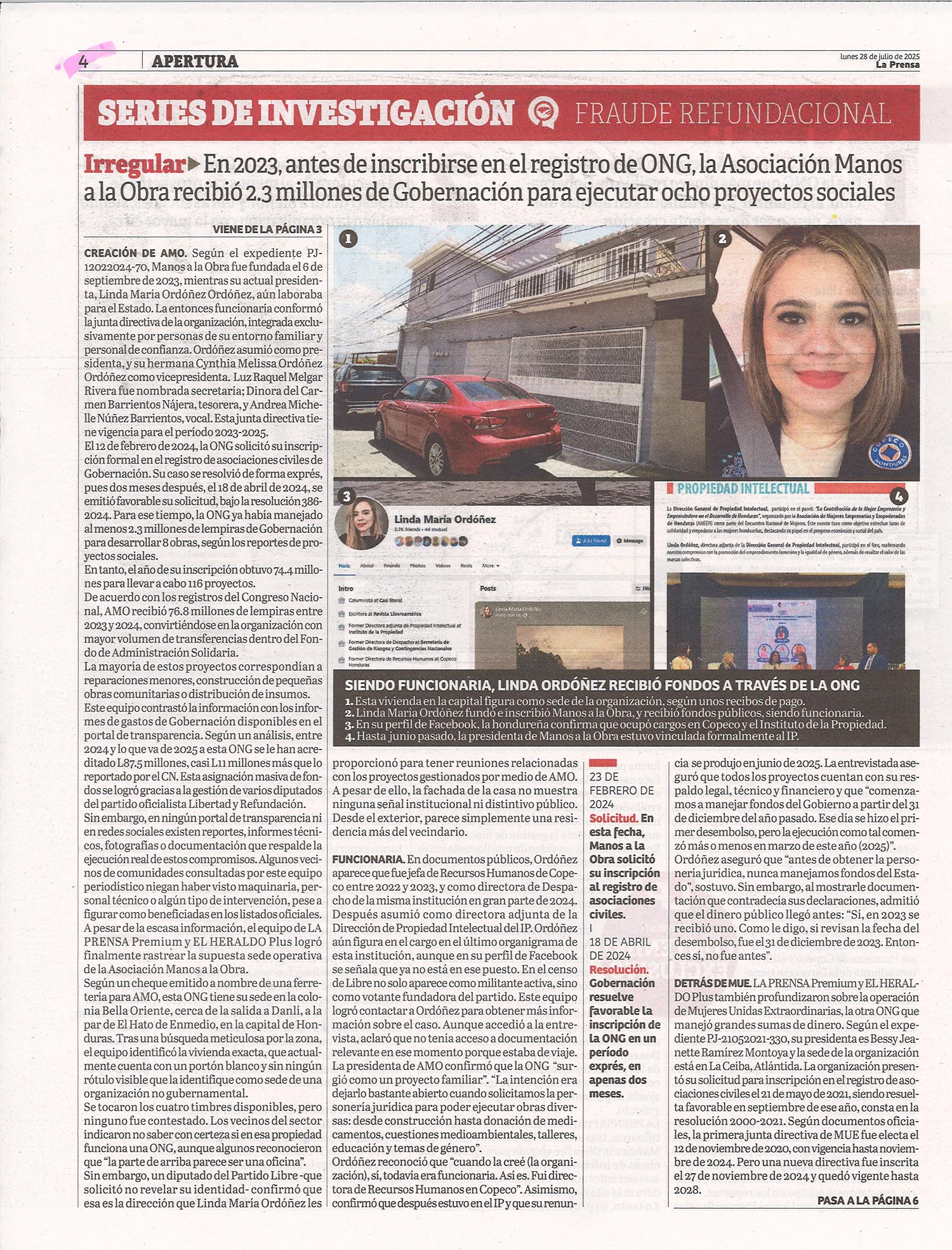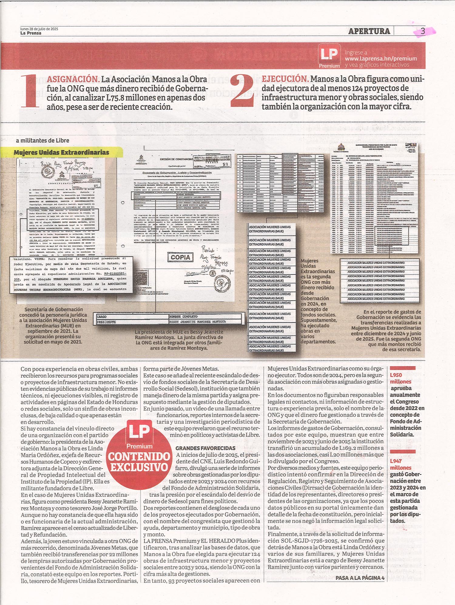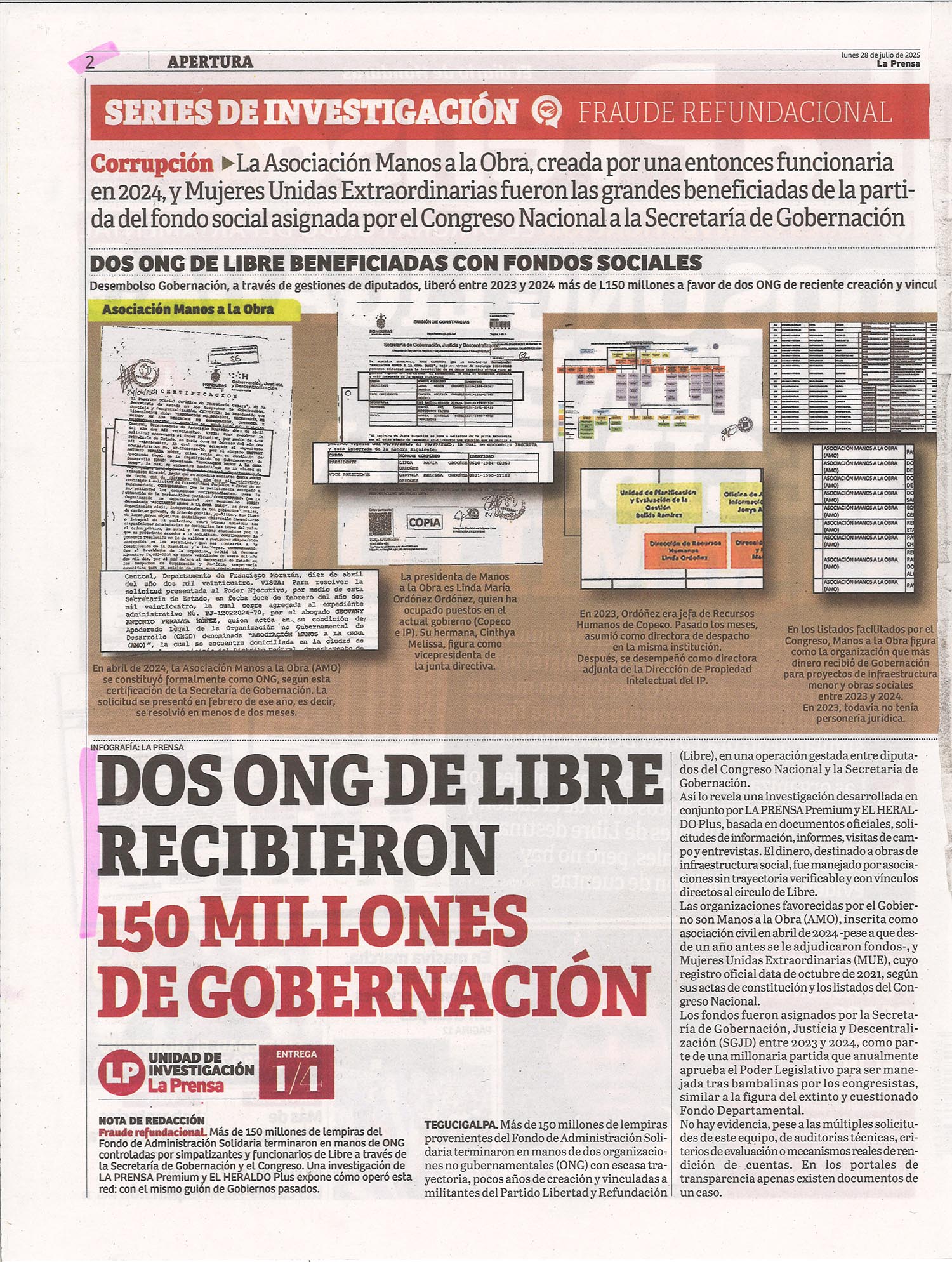 Nacionales Dos ONG de libre recibieron 150 millones de gobernación Odeth Aguilera Diario: La Prensa Fecha: 28 julio 2025 Páginas: 2,3,4 y 6