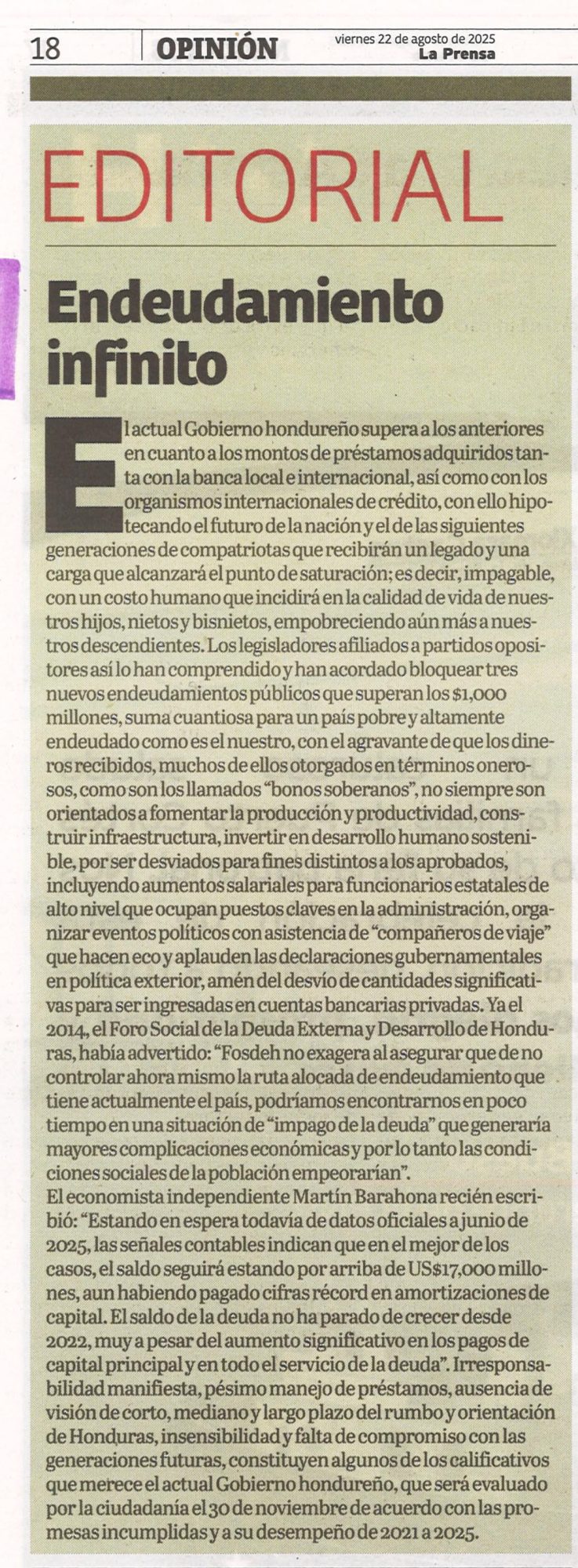 Nacionales EDITORIAL: Endeudamiento infinito Odeth Aguilera Diario: La Prensa Fecha: 22 agosto 2025 Página: 18