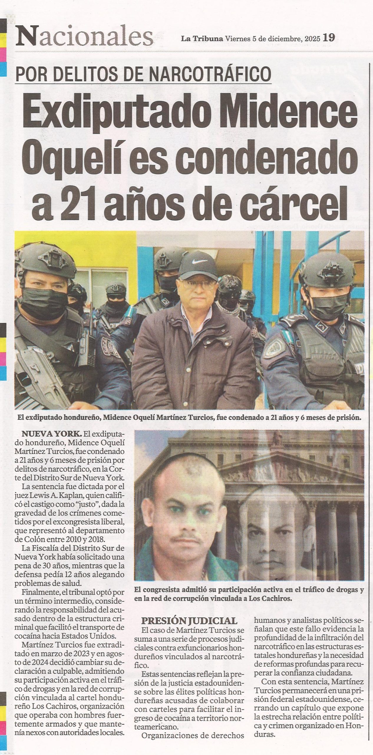 NacionalesPolicía Exdiputado Midence Oquelí es condenado a 21 años de cárcel Alejandra Irias Diario: La Tribuna Fecha: 5 Diciembre 2025 Página: 19