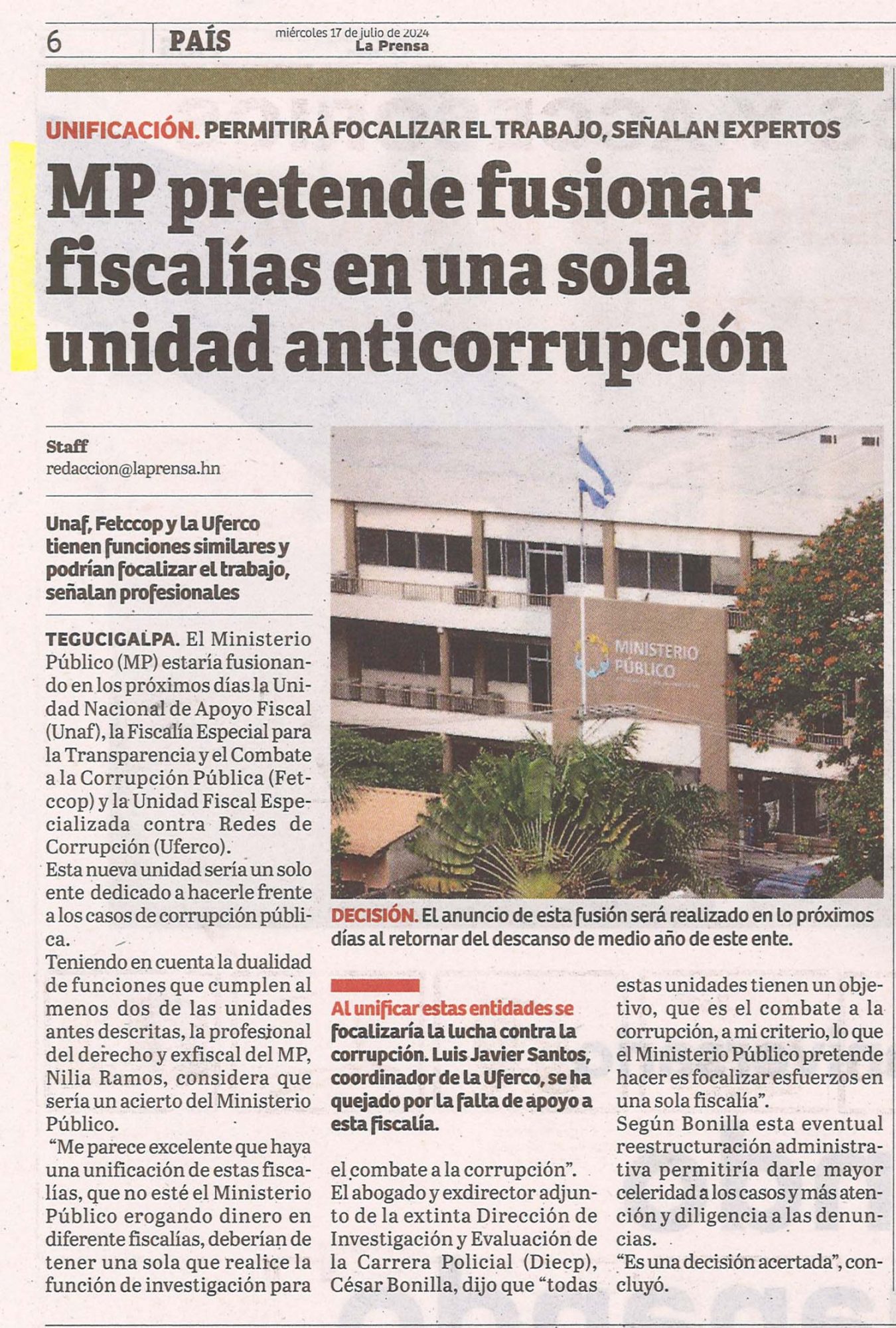 Nacionales MP pretende fusionar fiscalías en una sola unidad anticorrupción Odeth Aguilera Diario: La Prensa Fecha: 17 julio 2024 Página: 6