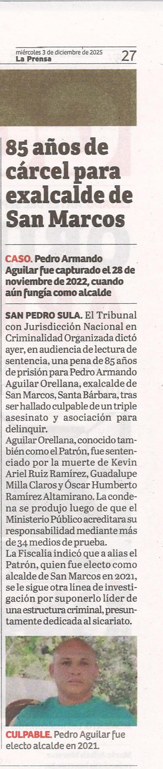 NacionalesPolicía 85 años de cárcel para exalcalde de San Marcos Alejandra Irias Diario: La Prensa Fecha: 3 Diciembre 2025 Página: 27