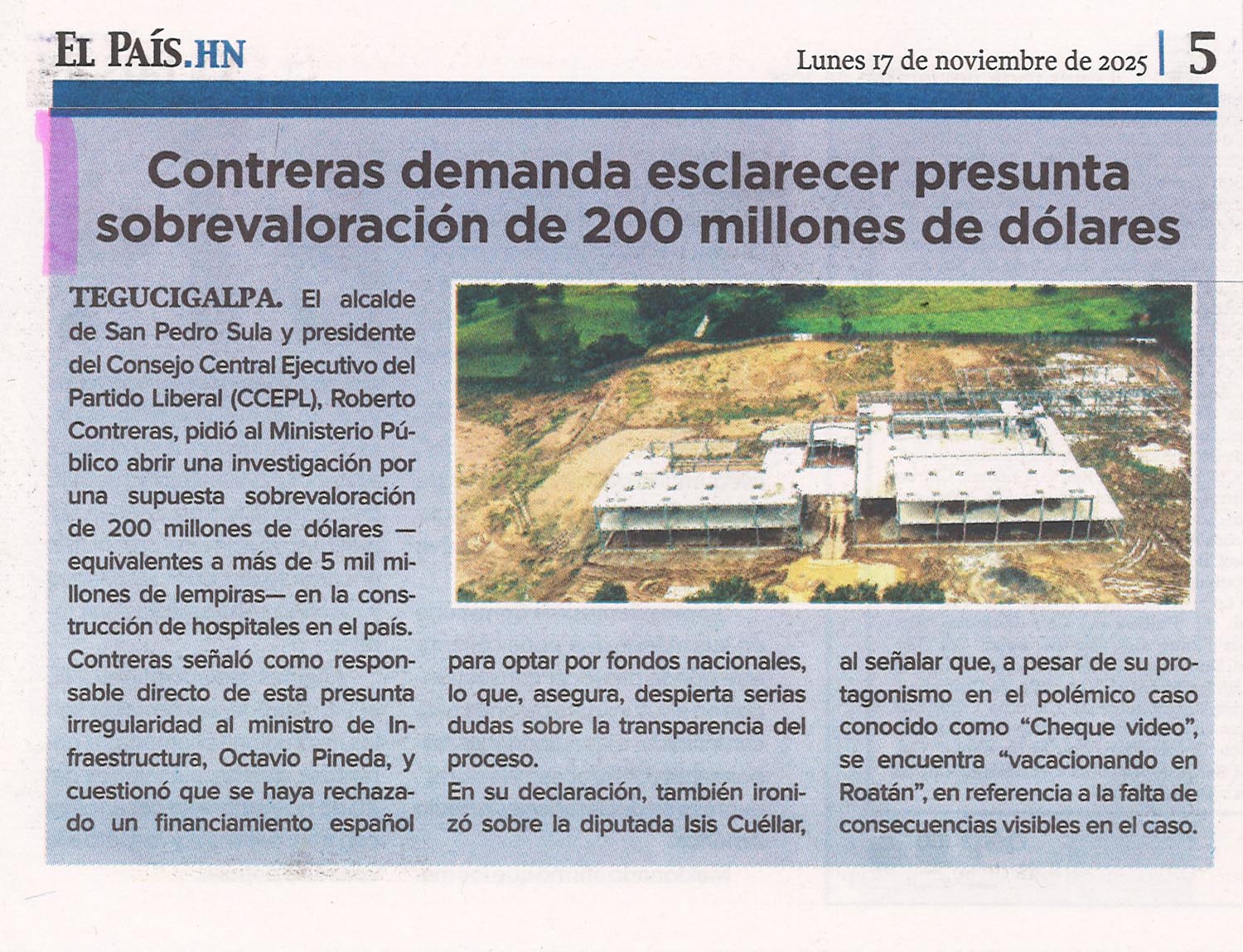 EconómicoNacionales Contreras demanda esclarecer presunta sobrevaloración de 200 millones de dólares Alejandra Irias Diario: El País Fecha: 17 Noviembre 2025 Página: 5