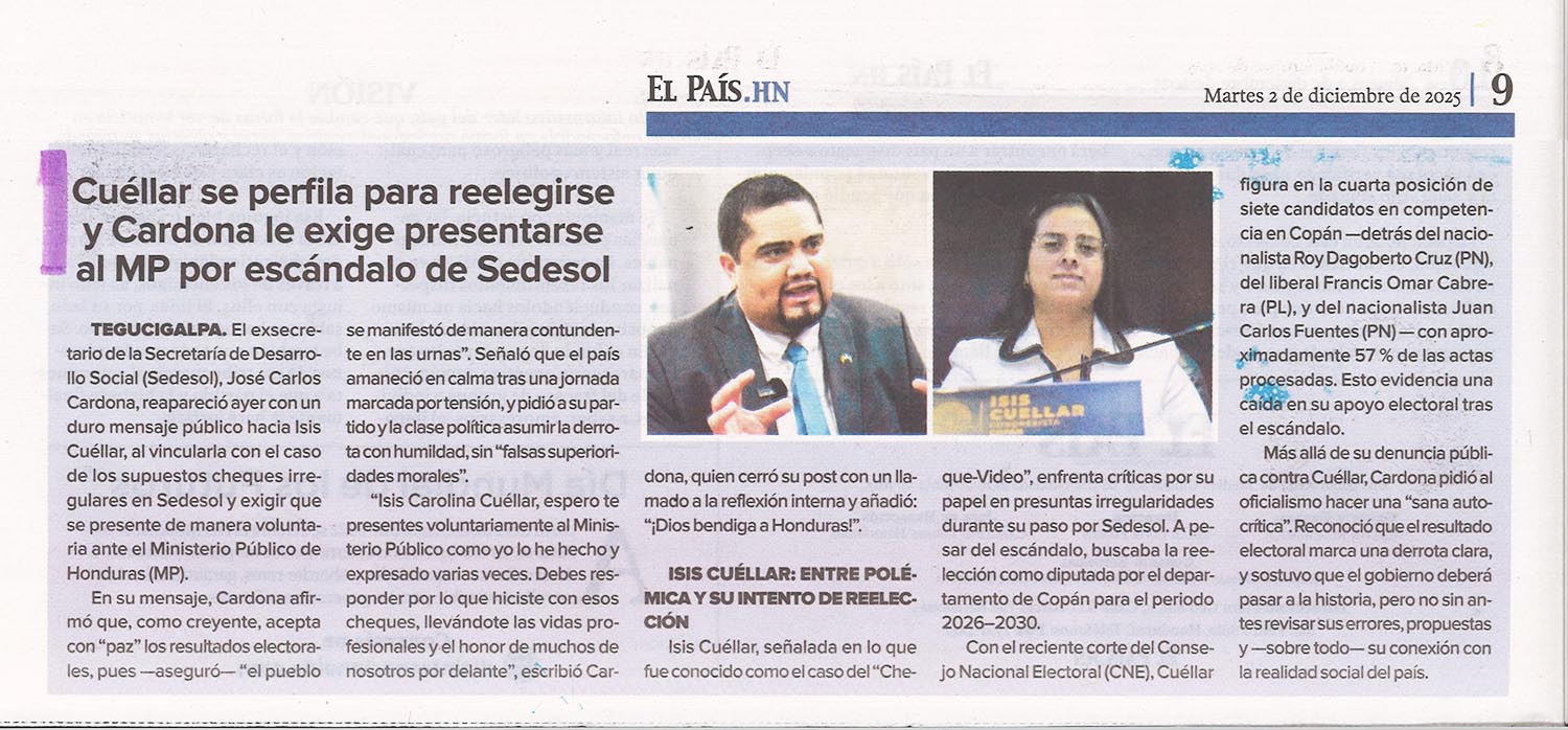 Casos EmblemáticosDenunciasNacionales Cuéllar se perfila para reelegirse y Cardona le exige presentarse al MP por escándalo de Sedesol Alejandra Irias Diario: El País Fecha: 2 Diciembre 2025 Página: 9