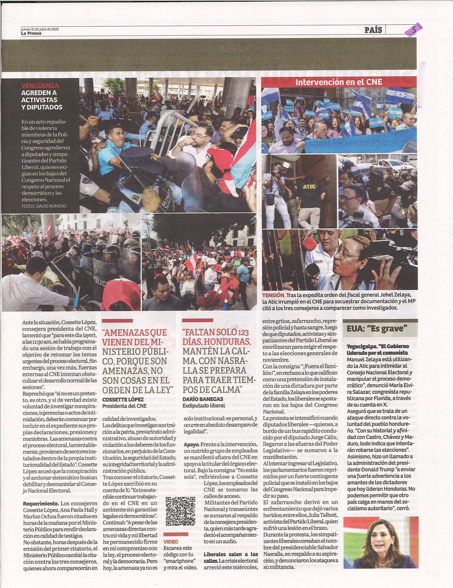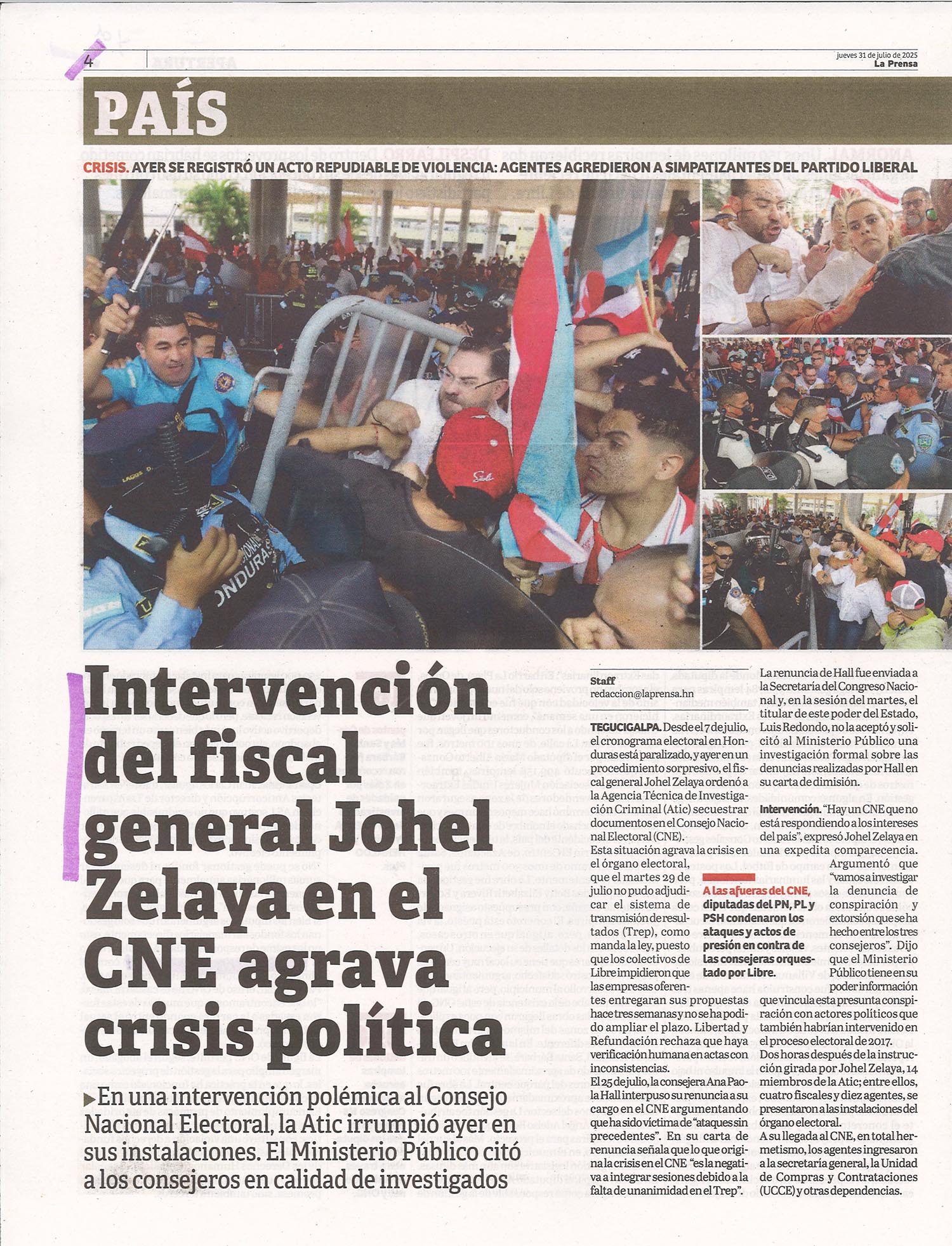 Nacionales Intervención del fiscal general Johel Zelaya en el CNE agrava crisis política Odeth Aguilera Diario: La Prensa Fecha: 31 Julio 2025 Páginas: 4 y 5