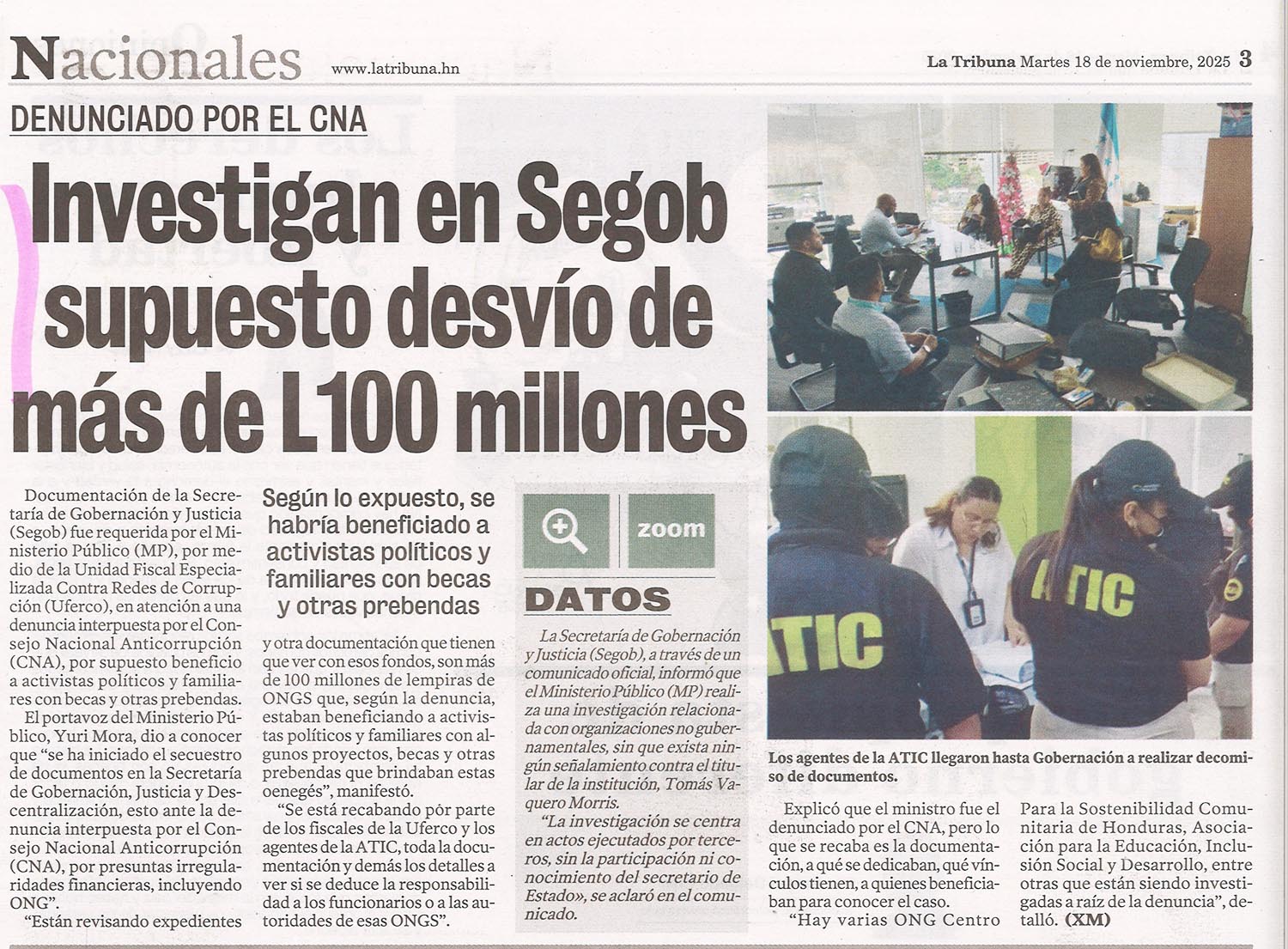 Nacionales Investigan en Segob supuesto desvío de más de L 100 millones Alejandra Irias Diario: La Tribuna Fecha: 18 Noviembre 2025 Página: 3