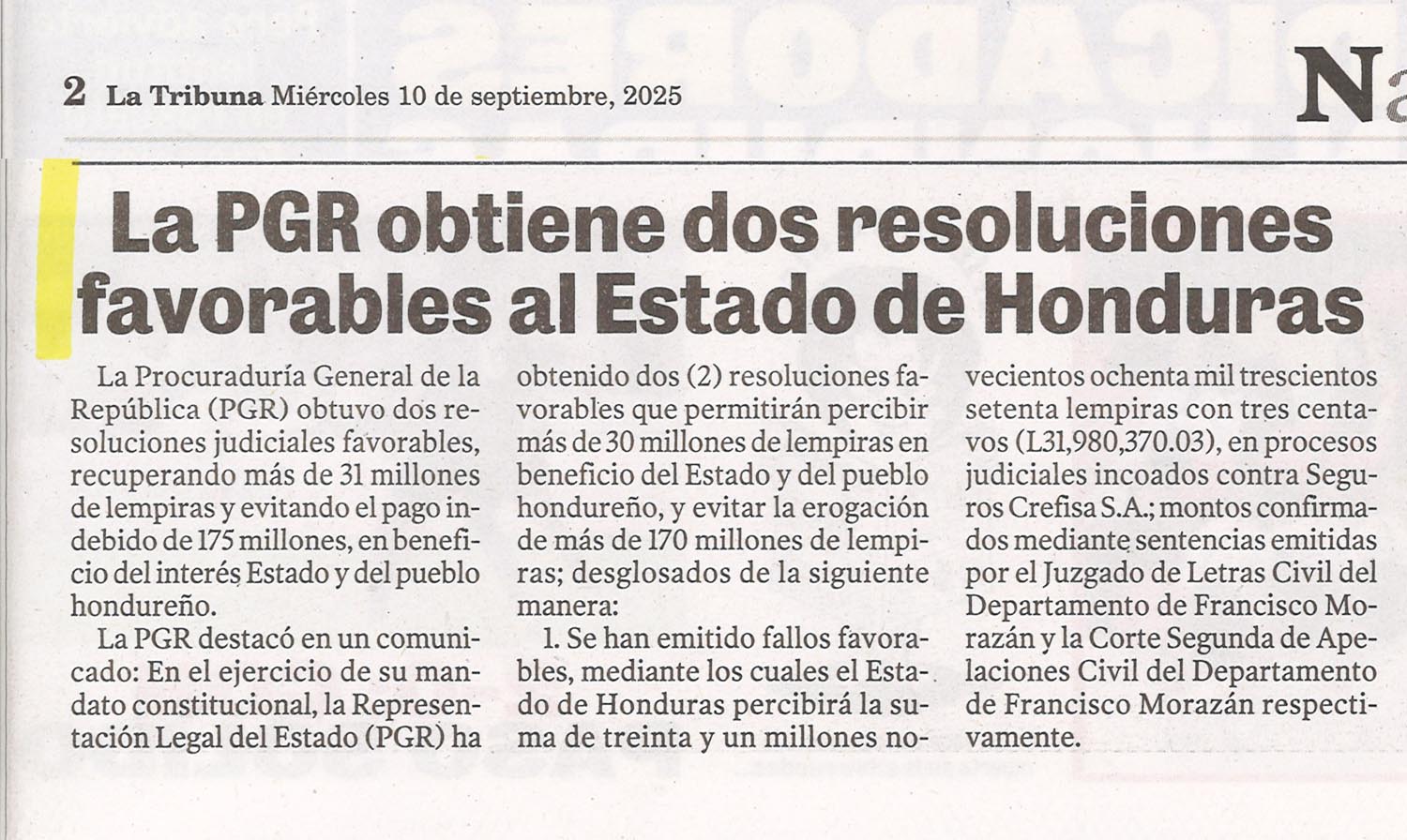 Nacionales La PGR obtiene dos resoluciones favorables al Estado de Honduras Odeth Aguilera Diario: La Tribuna Fecha: 10 Septiembre 2025 Página: 2