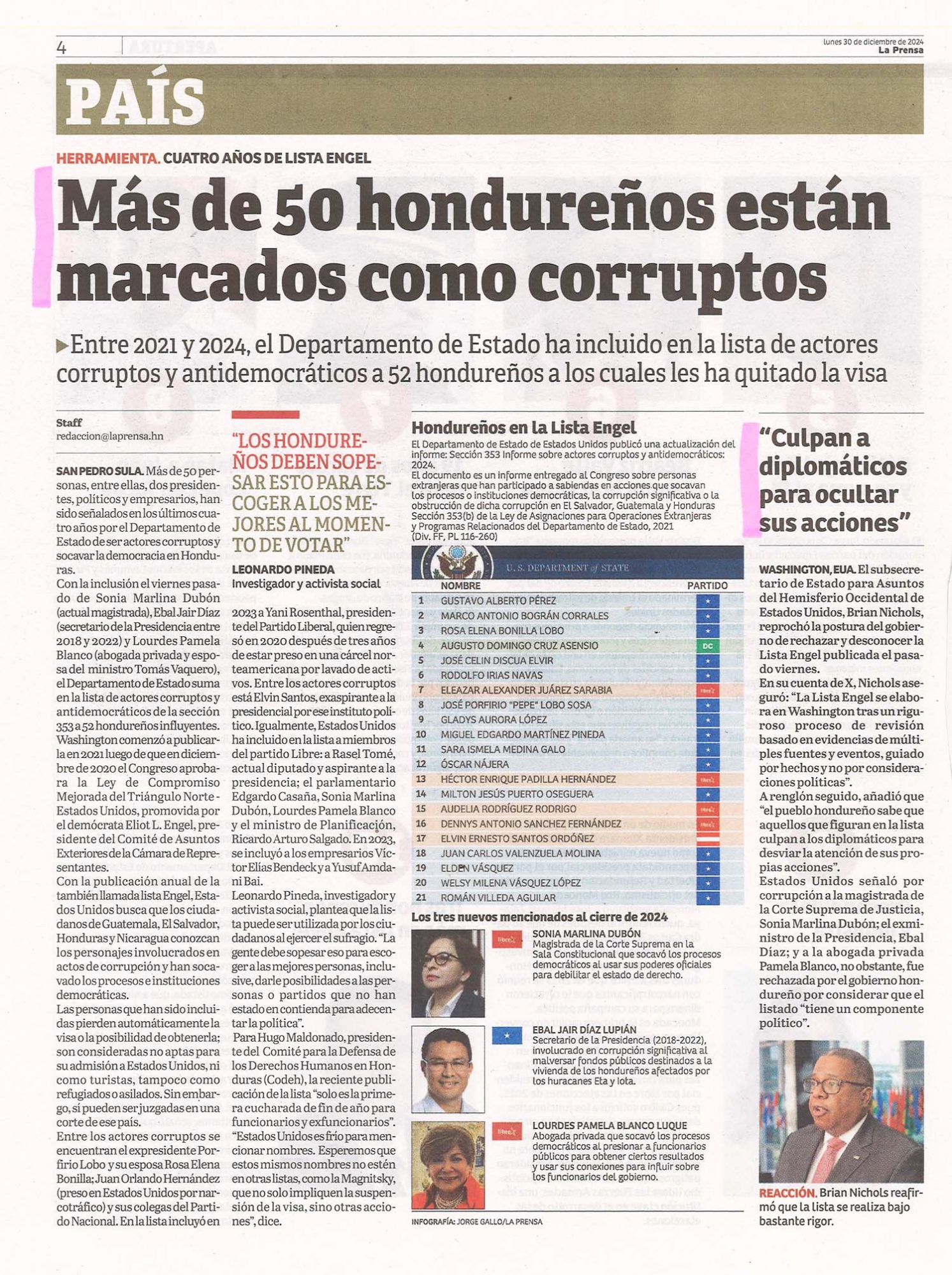 Nacionales Más de 50 hondureños están marcados como corruptos Odeth Aguilera Diario: La Prensa Fecha: 30 Diciembre 2024 Otras Publicaciones: «Culpan a diplomáticos para ocultar sus acciones» Página: 4