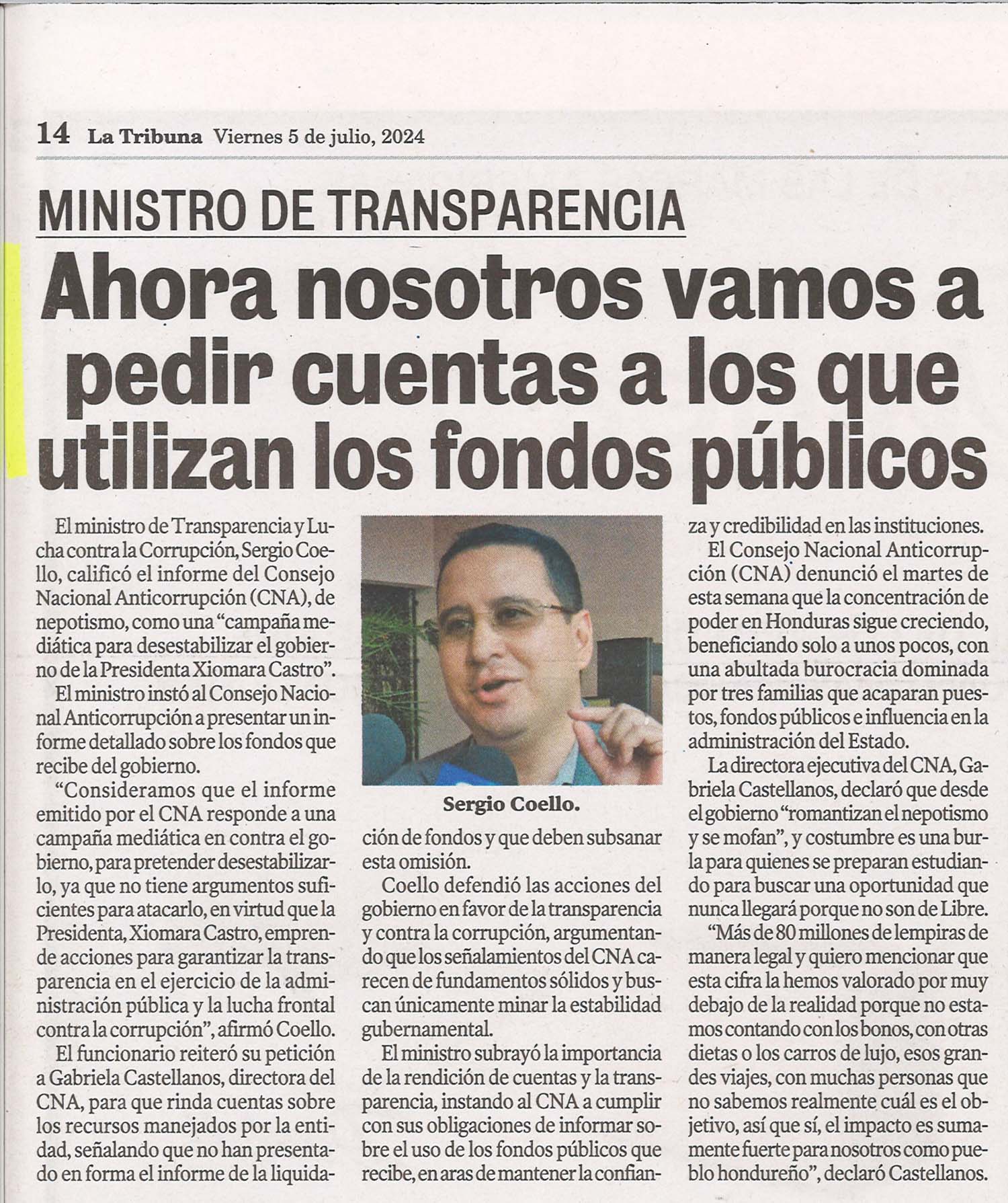 Nacionales MINISTRO DE TRANSPARENCIA: Ahora nosotros vamos a pedir cuentas a los que utilizan los fondos públicos Odeth Aguilera Diario: La Tribuna Fecha: 5 Julio 2024 Página: 14