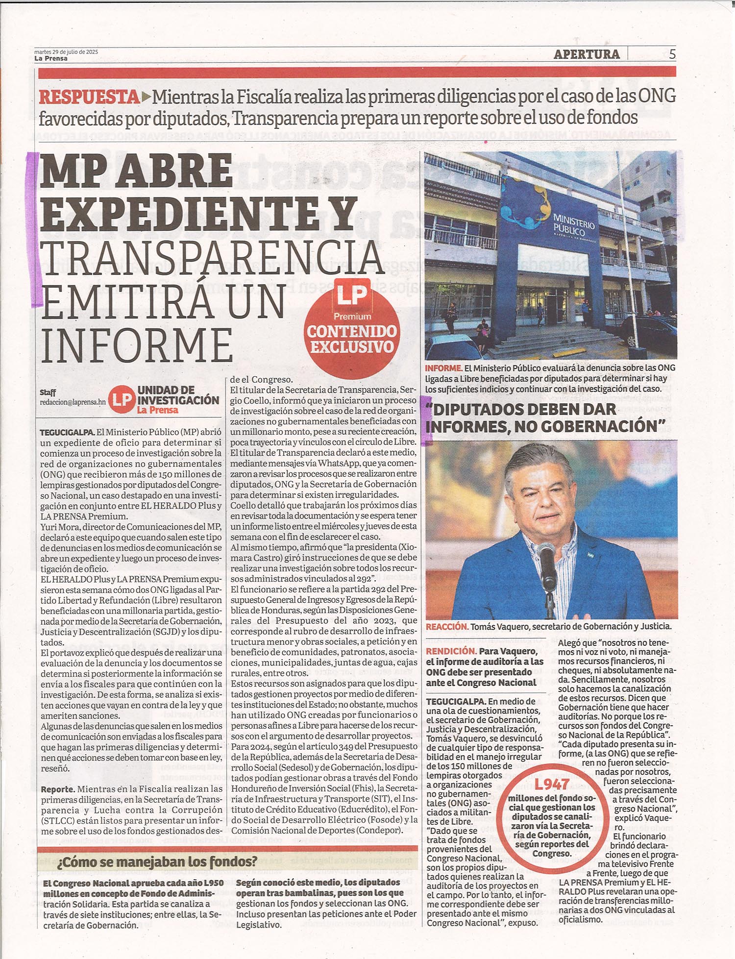 Nacionales MP abre expediente y transparencia emitirá un informe Odeth Aguilera Diario: La Prensa Fecha: 29 Julio 2025 Otras Publicaciones: «Diputados deben dar informes, no gobernación» Página: 5