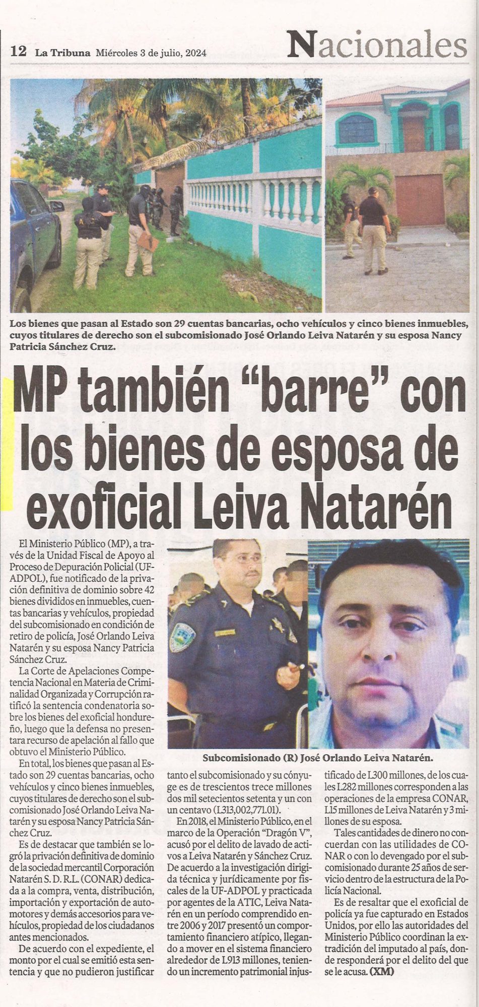Nacionales MP también «barre» con los bienes de esposa de exoficial Leiva Natarén Odeth Aguilera Diario: La Tribuna Fecha: 3 Julio 2024 Página: 12
