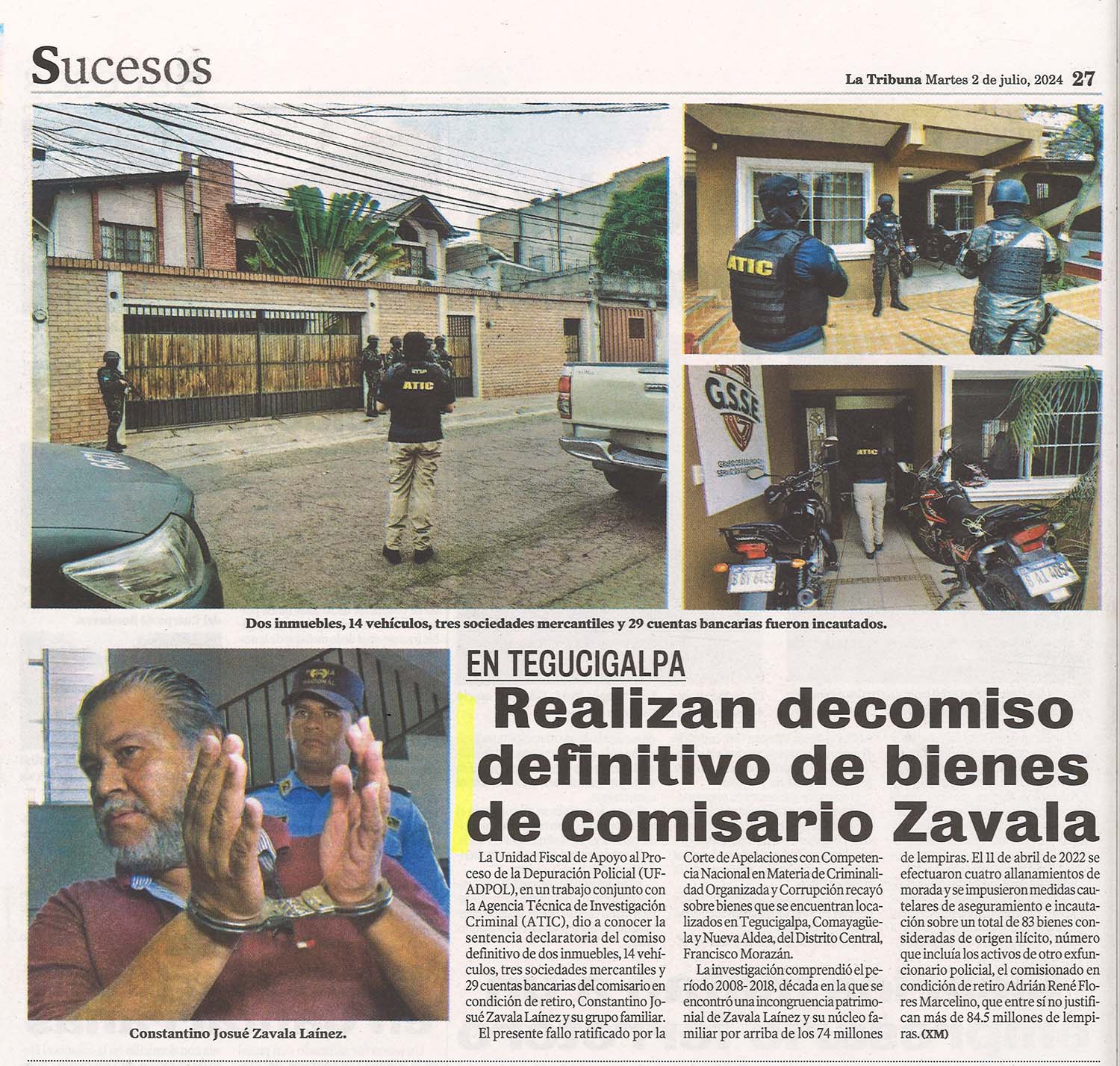 Nacionales Realizan decomiso definitivo de bienes de comisario Zavala Odeth Aguilera Diario: La Tribuna Fecha: 2 Julio 2024 Página: 27