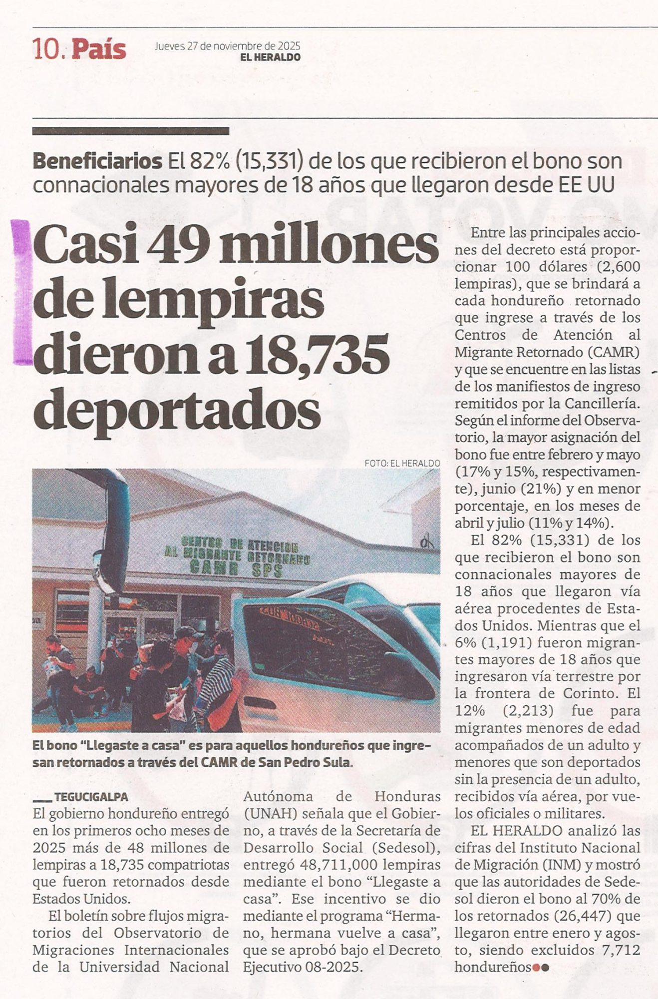 Nacionales Casi 49 millones de lempiras dieron a 18,735 deportados Alejandra Irias Diario: El Heraldo Fecha: 27 Noviembre 2025 Página: 10