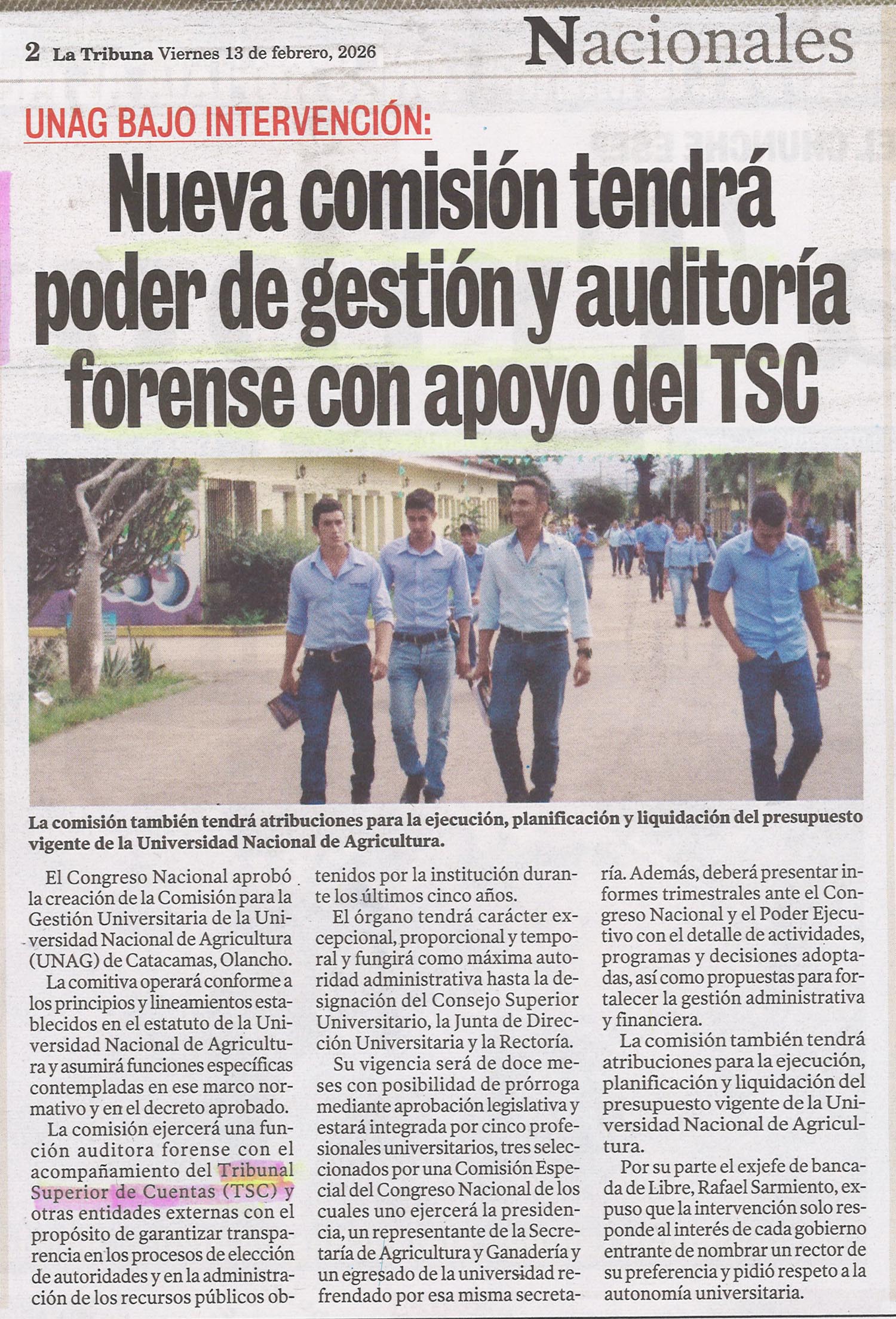 TSC UNAG bajo intervención: Nueva comisión tendrá poder de gestión y auditoría forense con apoyo del TSC ebueso Diario: La Tribuna Fecha: 13 de febrero de 2026 Página: 2