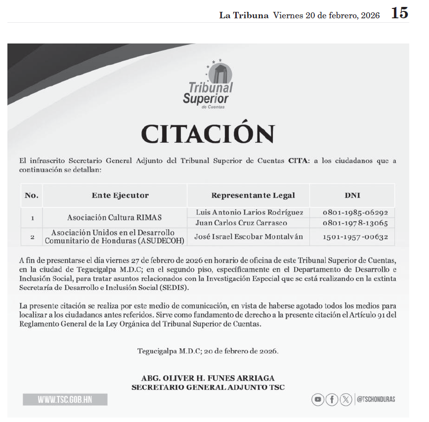 Notificaciones TSCTSC Citación – TSC ebueso Diario: La Tribuna Fecha: 20 de febrero de 2026 Página: 15
