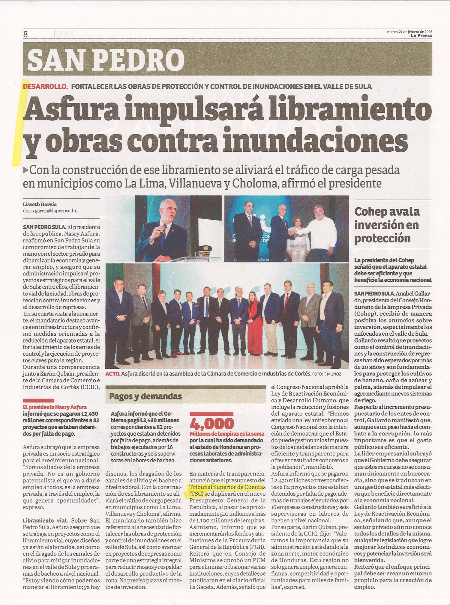 TSC Asfura impulsará libramiento y obras contra inundaciones ebueso Diario: La Prensa Fecha: 27 de febrero de 2026 Página: 8