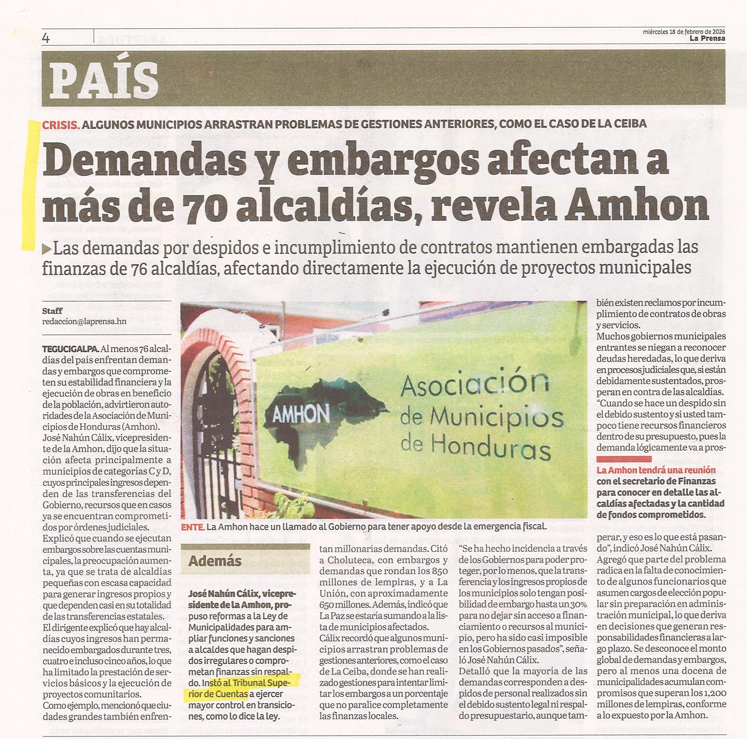 MunicipalidadesTSC Demandas y embargos afectan a más de 70 alcaldías, revela Amhon ebueso Diario: La Prensa Fecha: 18 de febrero de 2026 Página: 4